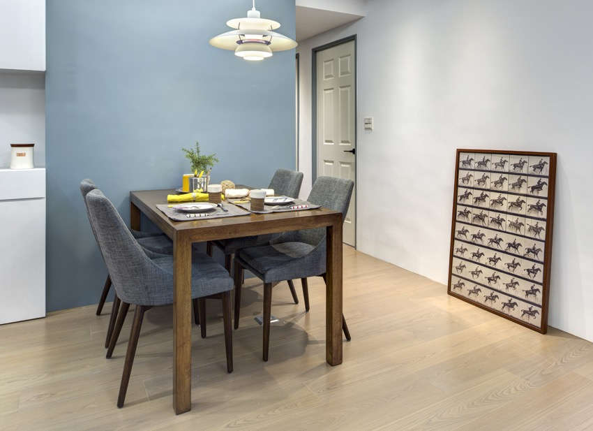 小家庭格局选择开放式空间规划,单纯希望增加更多使用面积,放大视觉感受,特别是有小朋友家庭,总想着妈妈在厨房料理同时能注意孩子动向,设计师表示只需加入长型实木餐桌、舒适布面餐椅摆放,便能「多全其美」。不再只有摆放美味佳肴,享受全家人聊天团聚欢乐的功能,跟随使用需求,变成孩子阅读、游戏书桌、小夫妻夜半私密聊天场地(记得放些质感餐盘、餐具营造高级餐厅氛围)、工作计算机桌等,一物多用的高 CP 值实质机能,充分满足生活享受,这可是固定装修无法达到的效果喔!至于温暖混搭风格定位,透过一盏设计灯饰,加上灰色感色彩墙面便搞定,百搭的强烈包容性,象是圣诞节、跨年或是过年要放布置品,完全毫无违和感。