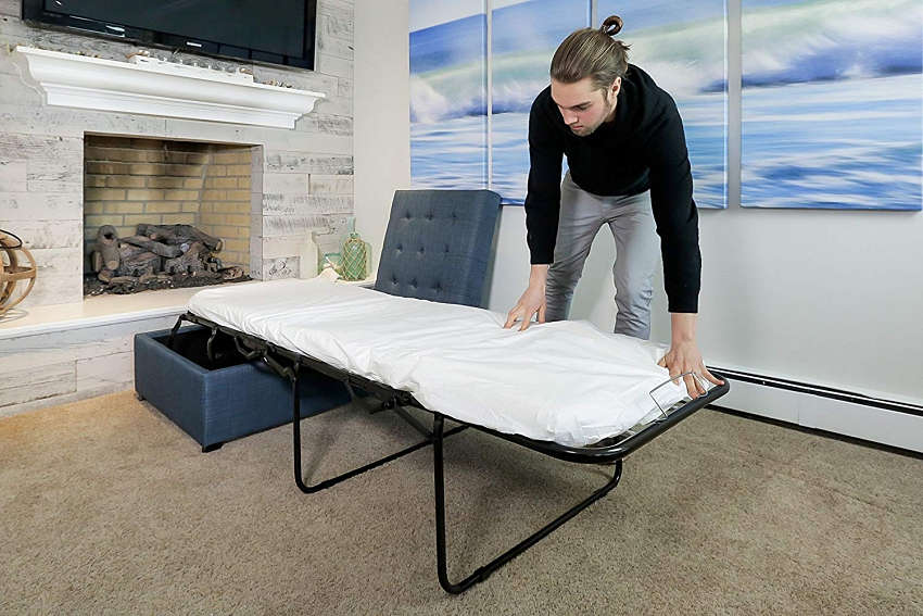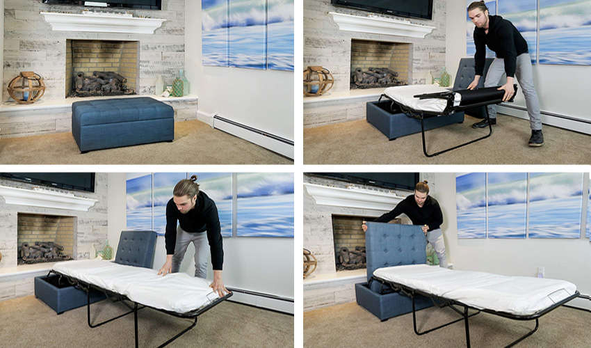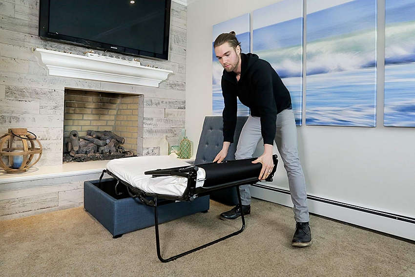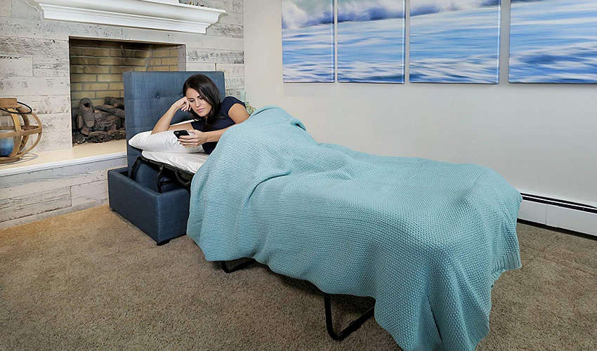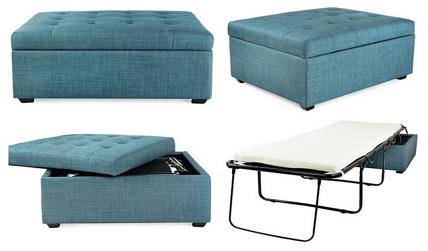 平时放置客厅,即是一张优雅精巧的小椅凳,当客人下榻时,则可将隐藏内部的折叠床迅速展开,其床架不仅附设弹簧支撑,也拥有柔软泡绵床垫,总长度更可延展近 185 公分,不论大人小孩皆能安心入睡。材质方面除布料外还提供深褐皮革,完美适应各种风格。