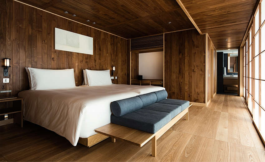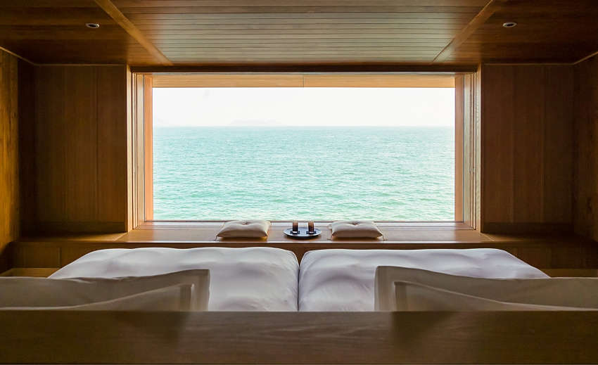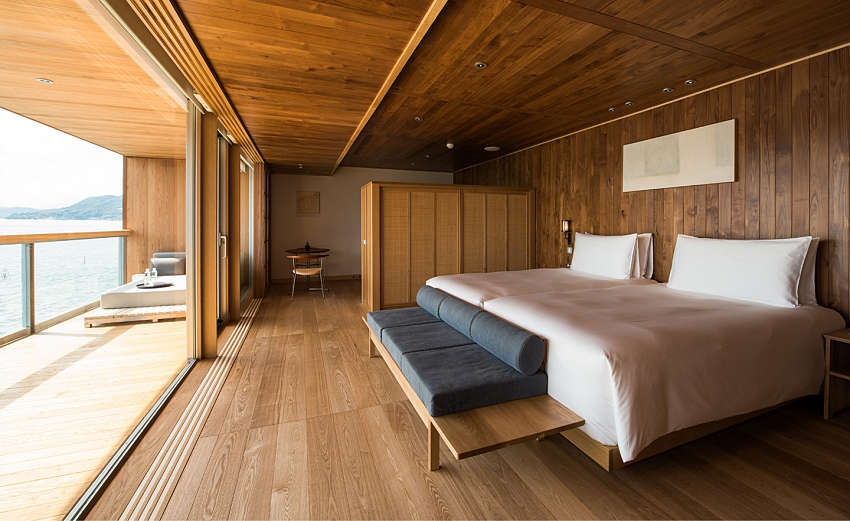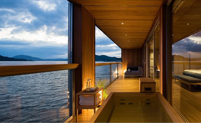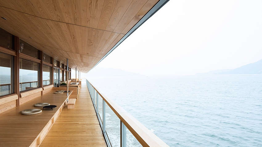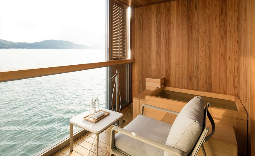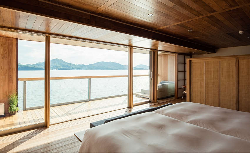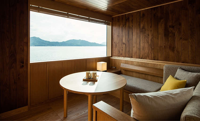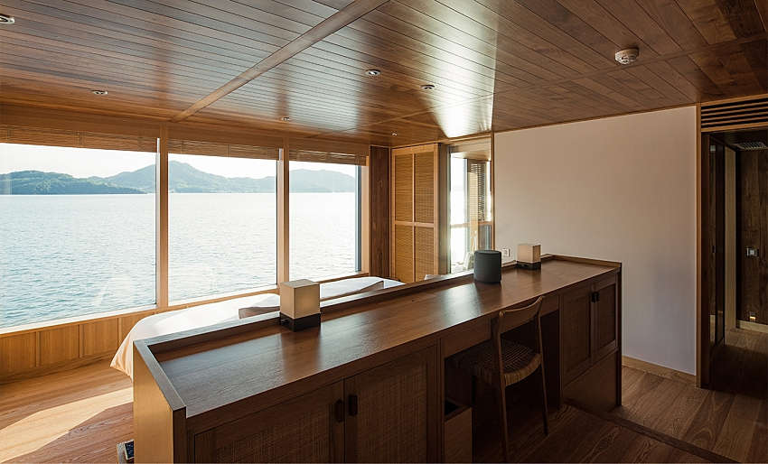 船身采用银色基调,使船体随着海洋转换色调、与周遭景致融为一;客舱共有四款房型,藉由大量木造呈现海面平静意象,每间房皆拥有露天阳台,让人们在充满日式风味的房间中,细细感受缓慢流动的时间与海景,赋予游客静谧温暖的感受。