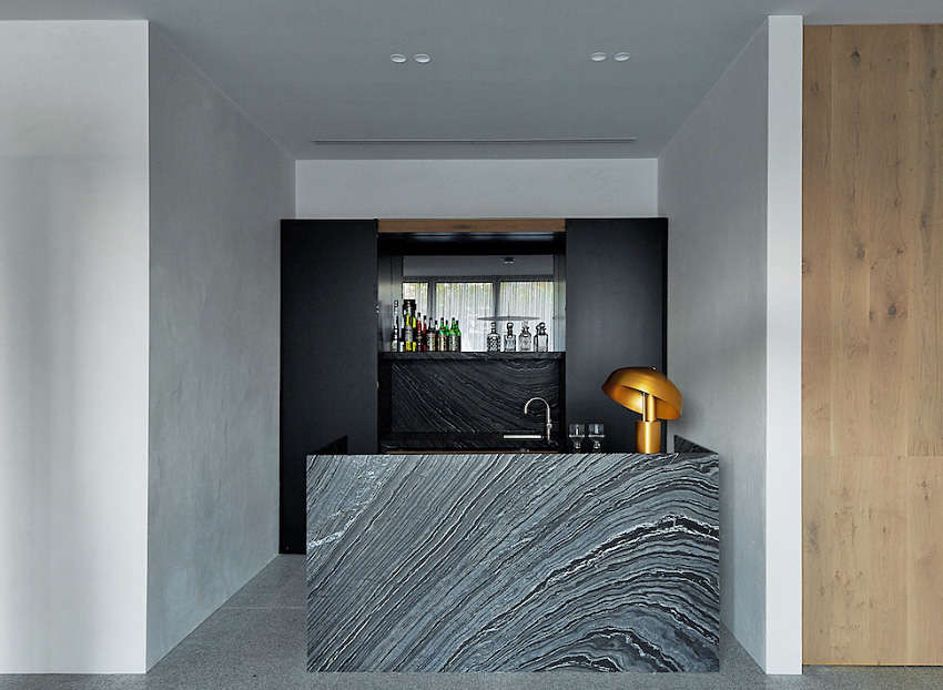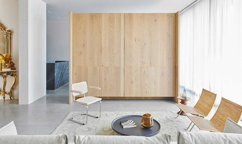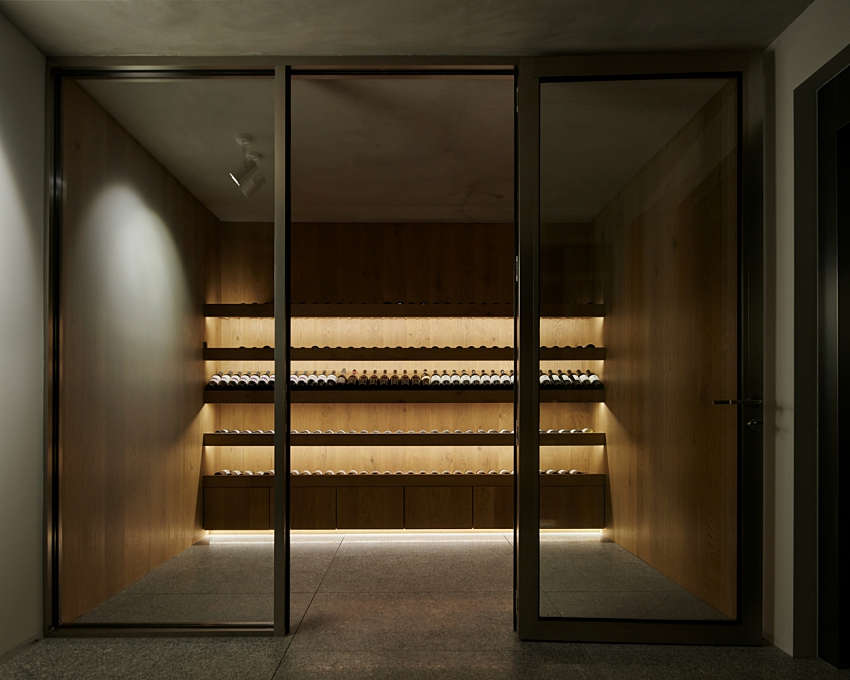 地面铺设灰阶花岗岩地砖,再摆上几组木质调家具,让天然材质衬托光影,为冷调空间注入一股舒适柔和气息。