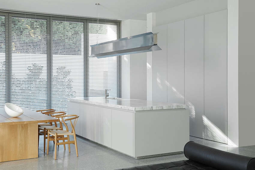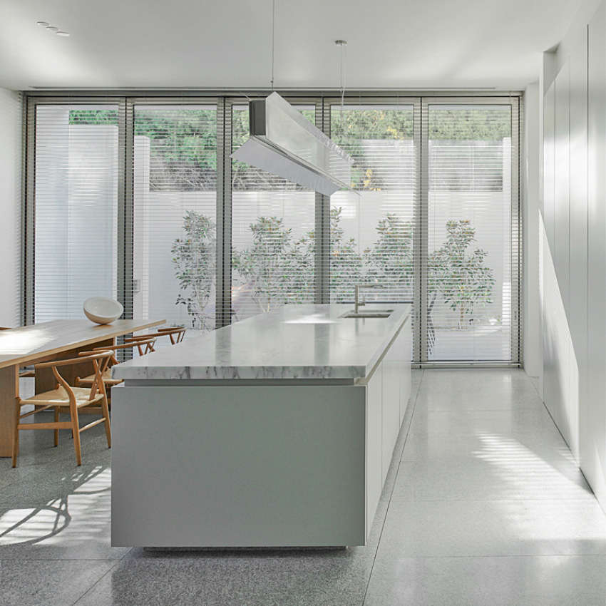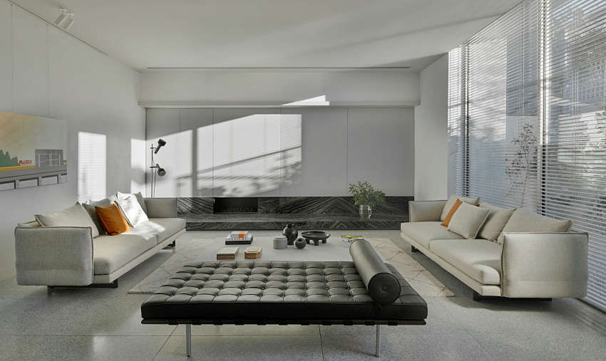 穿越过一旁绿意廊道,即可到达房屋内部,先于壁面透过威尼斯石膏艺术涂料延续外在净白色调,并于窗户设置百叶帘,让自然光经由间隙流泻而入,使墙面随着时光流逝,呈现独特风貌。