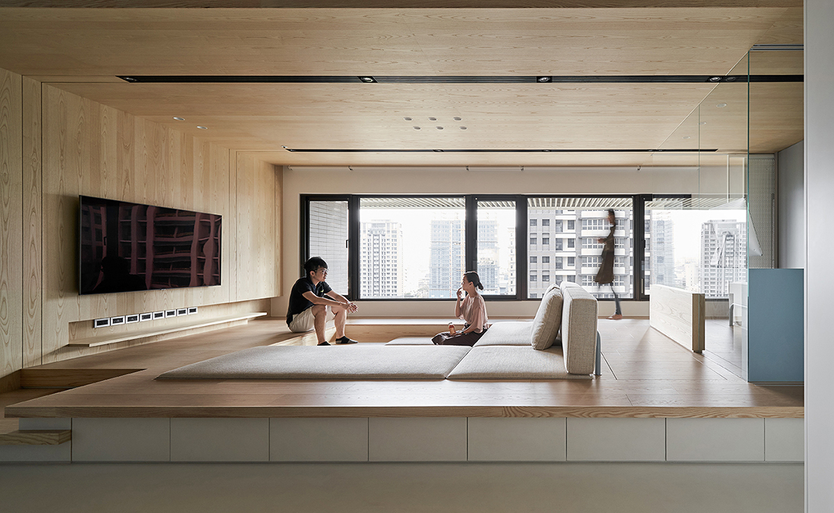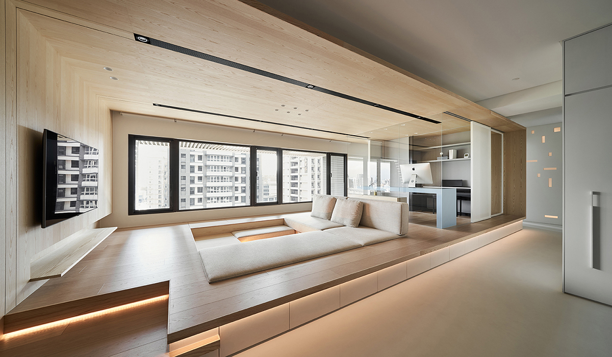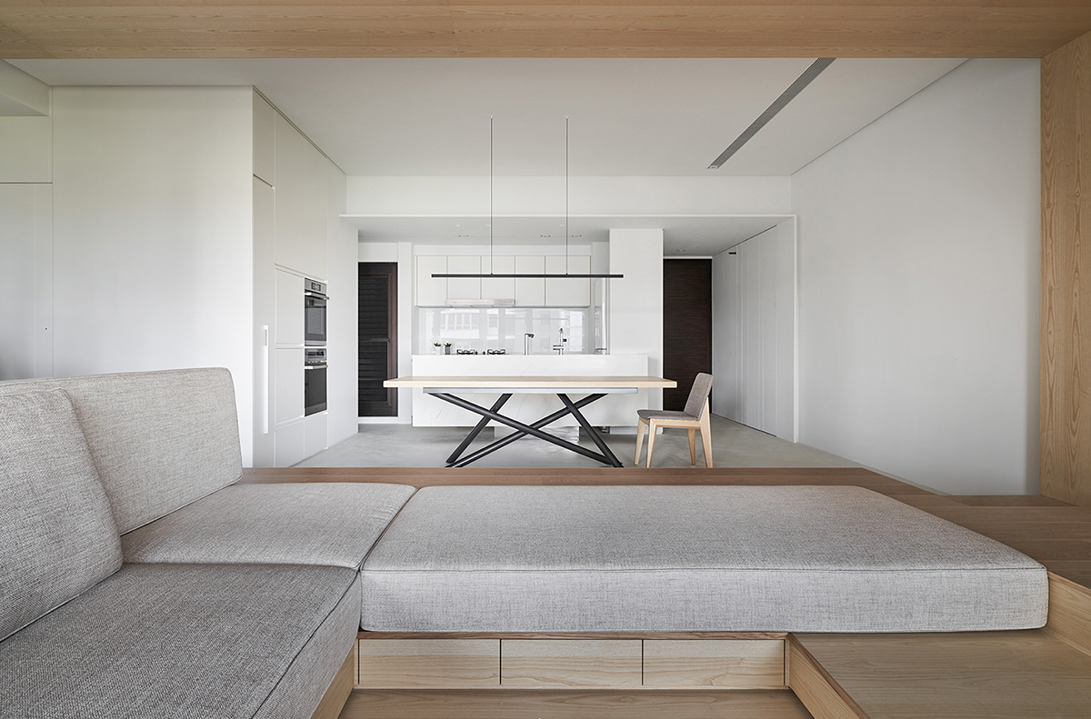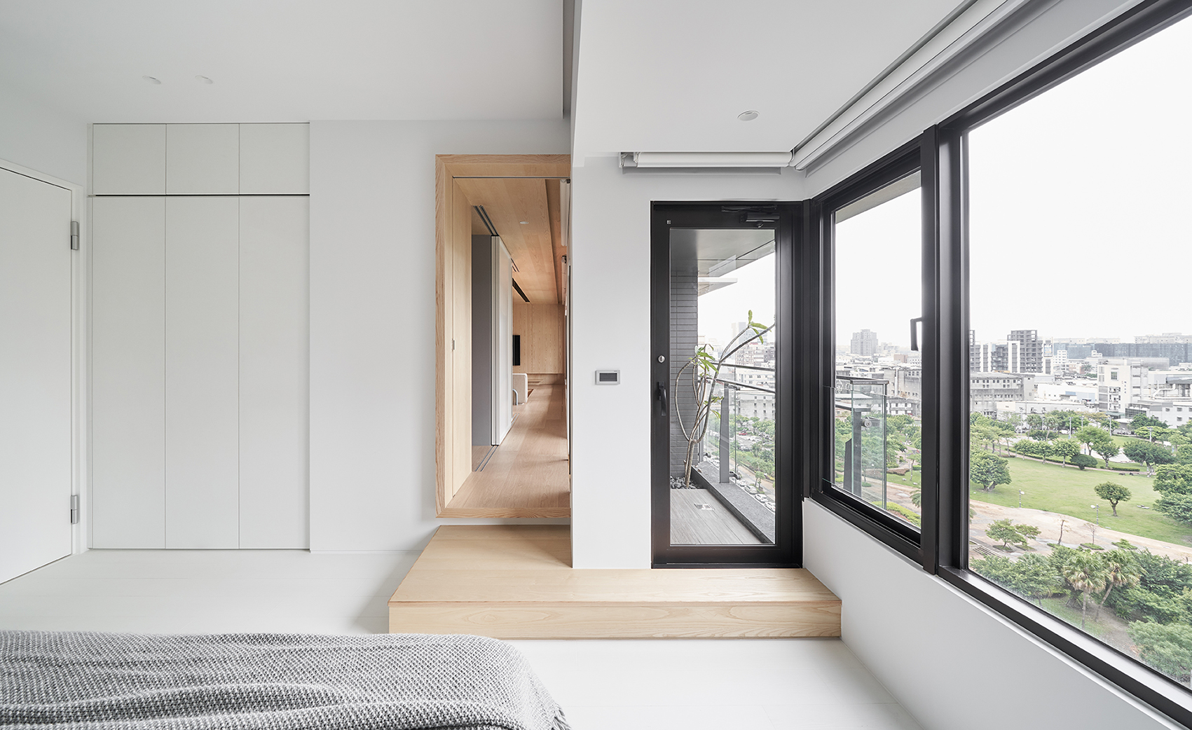 诠释穿梭白盒与木盒之间的关系,更利用同一道踏阶连动户外阳台,适度地将采光贯穿于内,也引入窗外绿意。