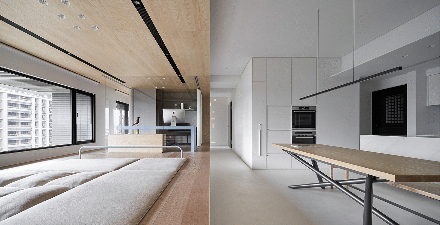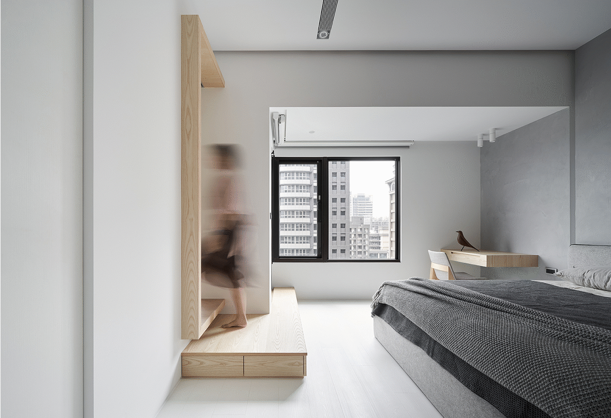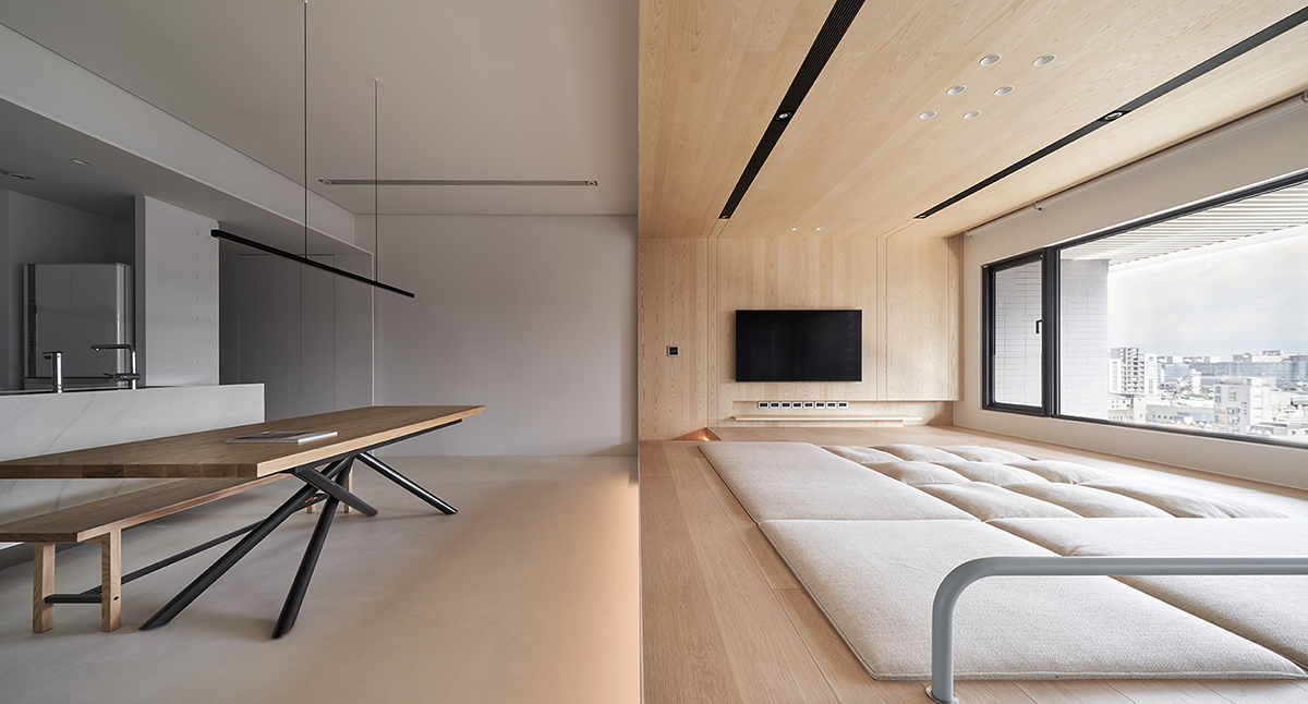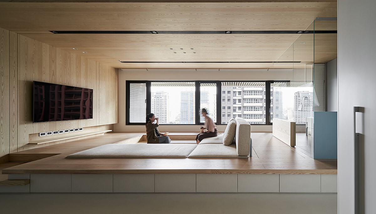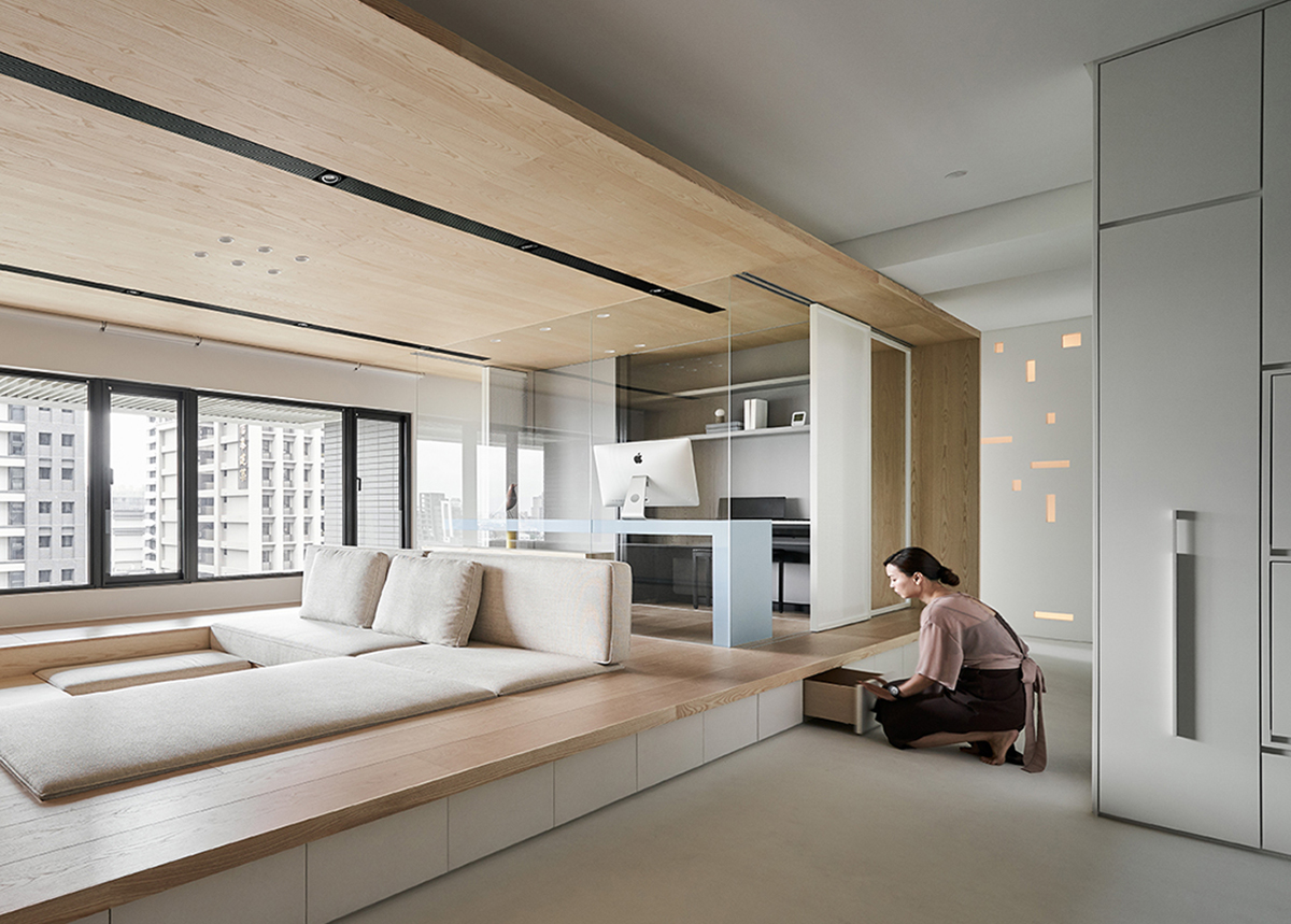 诠释穿梭白盒与木盒之间的关系,更利用同一道踏阶连动户外阳台,适度地将采光贯穿于内,也引入窗外绿意。