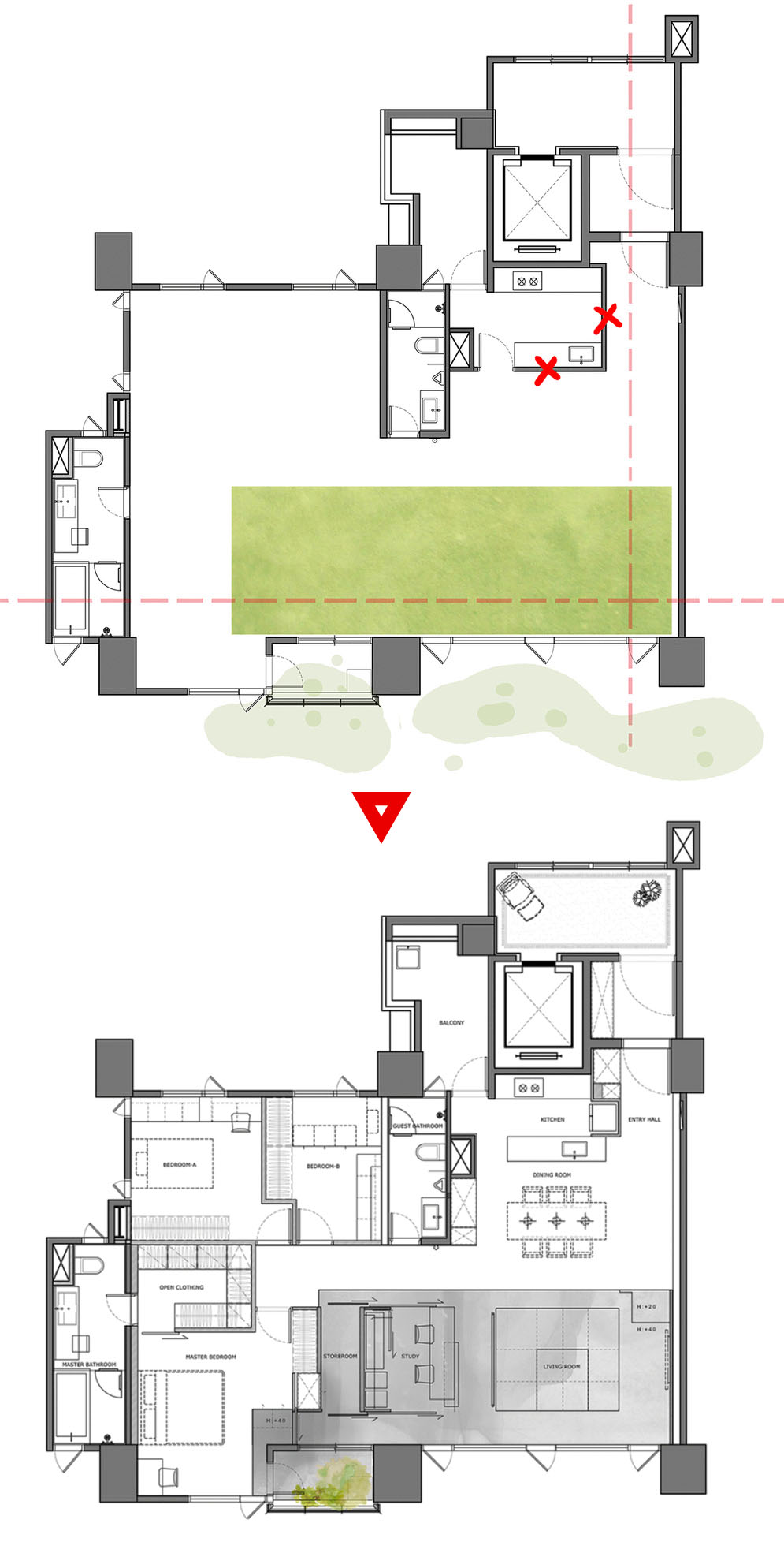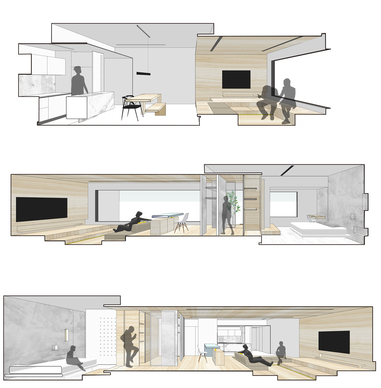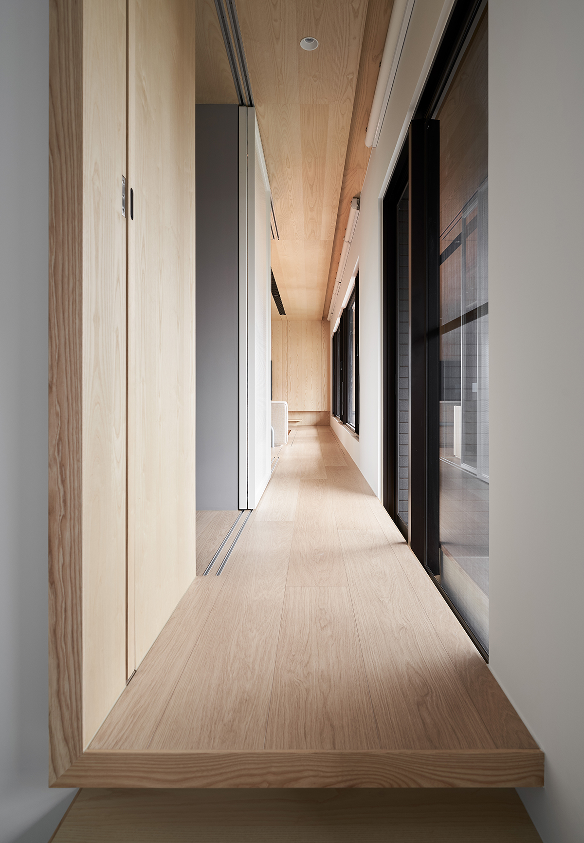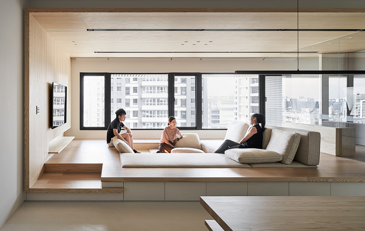 诠释穿梭白盒与木盒之间的关系,更利用同一道踏阶连动户外阳台,适度地将采光贯穿于内,也引入窗外绿意。