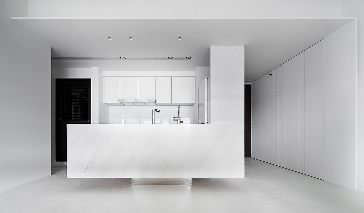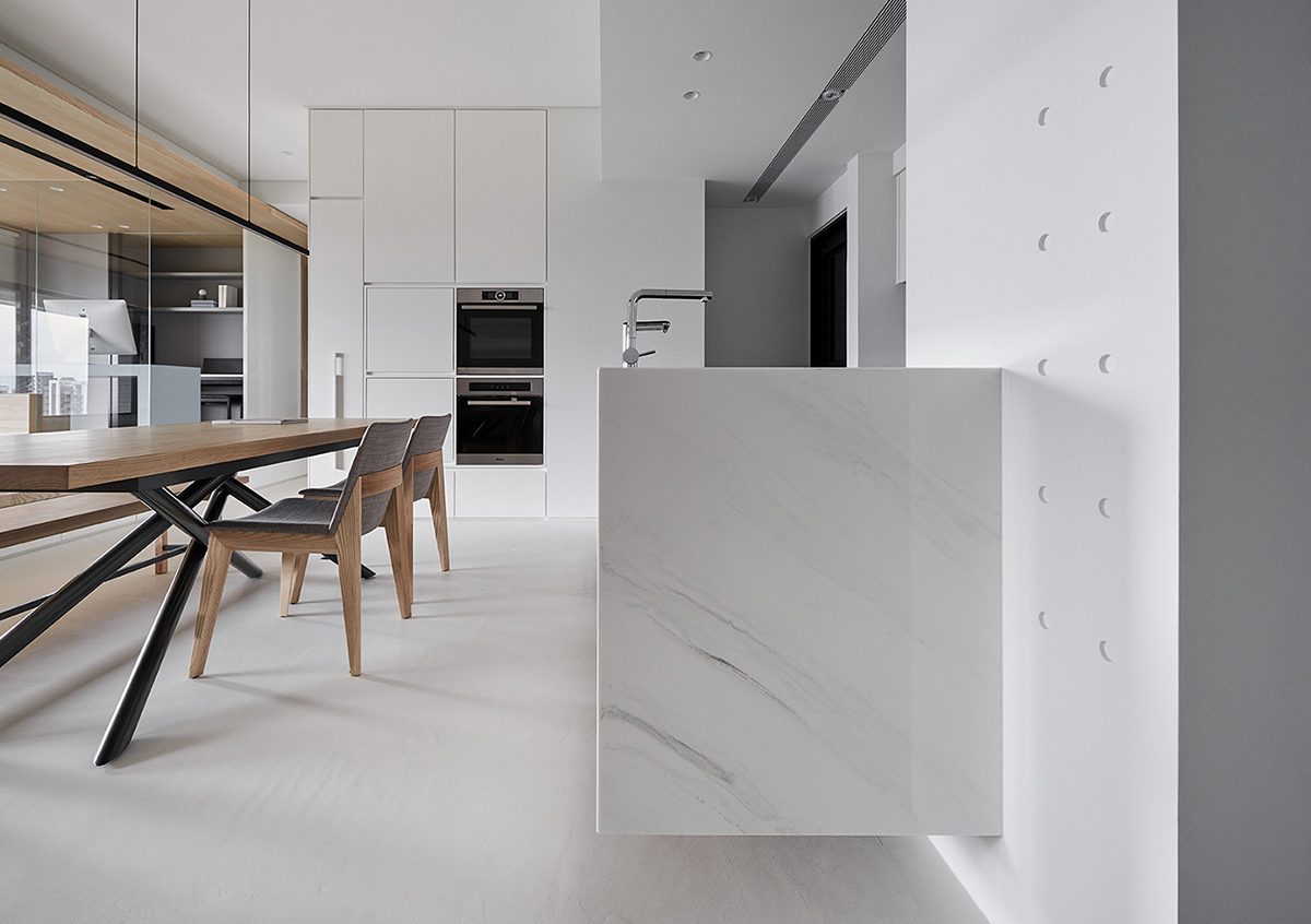 为了减轻全白厨具份量,采纳带有一抹石材纹理的中岛,并将底座内缩赋予漂浮视感,厨具收纳则以置顶落地的方式收整于墙面,利落擘画氛围。