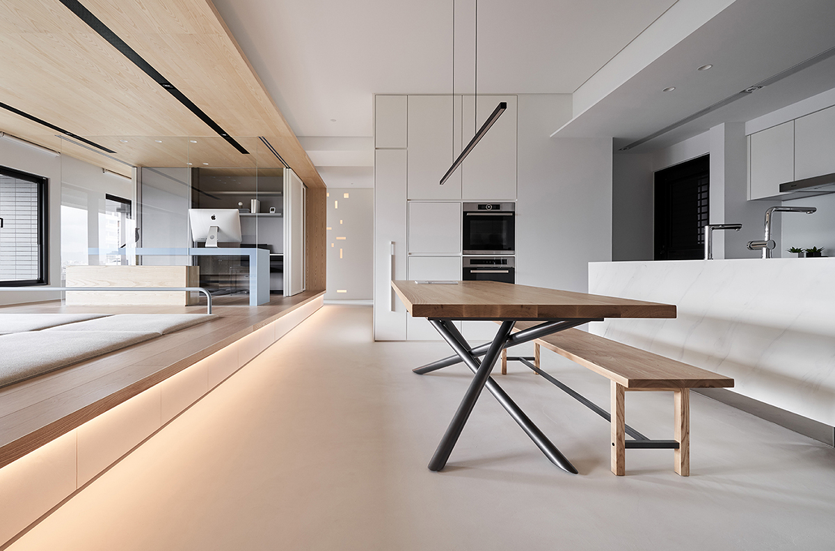 卸下厨房壁面,以开放式格局呈现无遮蔽视野,提升领域互动,同步利用造型墙面连结天花,勾勒一隅白色框景,恰似对应着木盒空间,象征着回归纯粹的日常。