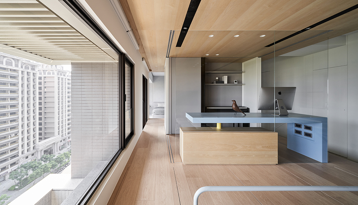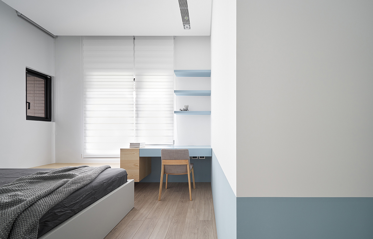 活泼苍青色腰墙带动视觉动线,更将色彩延伸至书桌与层架,妆点澄透明亮全室的采光,桌旁承接木质卧榻,推展一处与阳光腻在一起的生活情境。