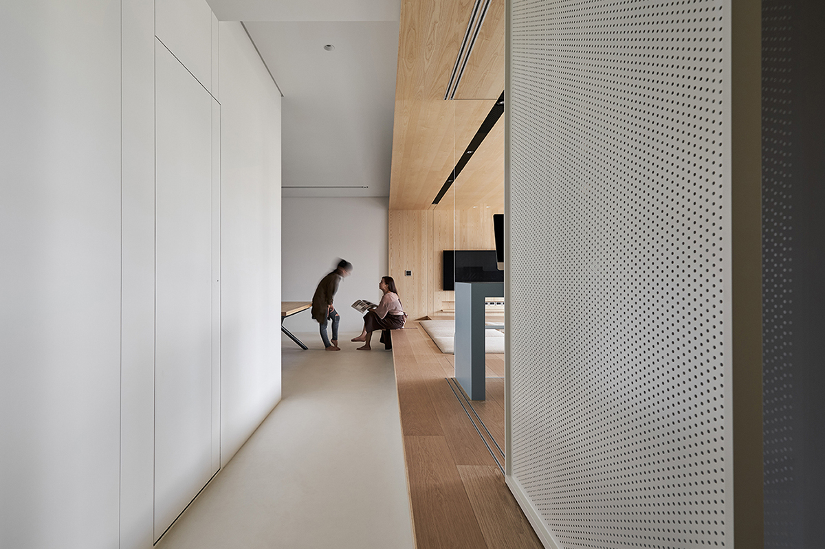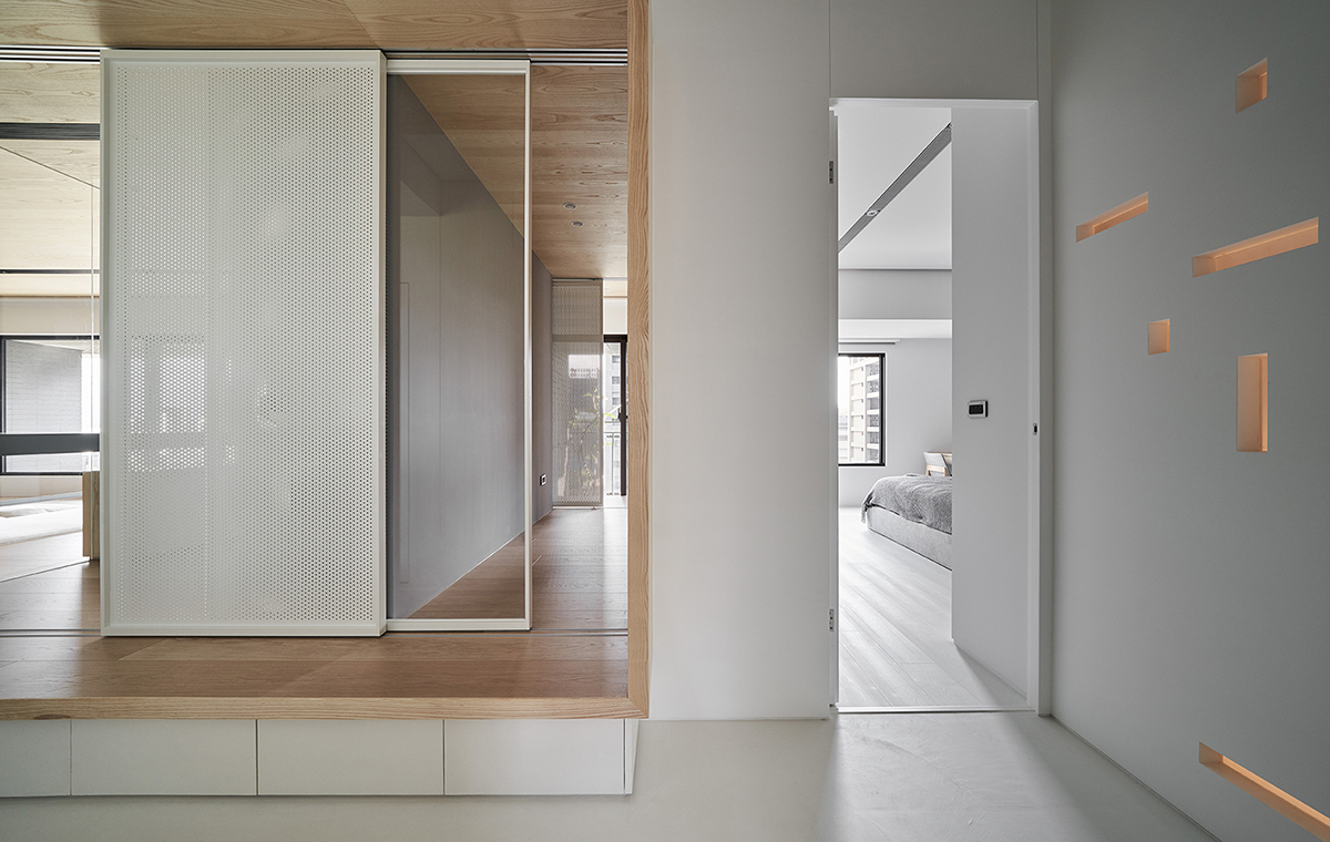 书房后方连结储藏室,两处格局皆采用白色冲孔板拉门串接整体动线,适时地引入光线与阳台绿意,循着木盒子外的白色廊道通往私领域,走廊尽头点缀方孔拼接墙面,透散着暧昧黄光,添抹些许穿透表情。