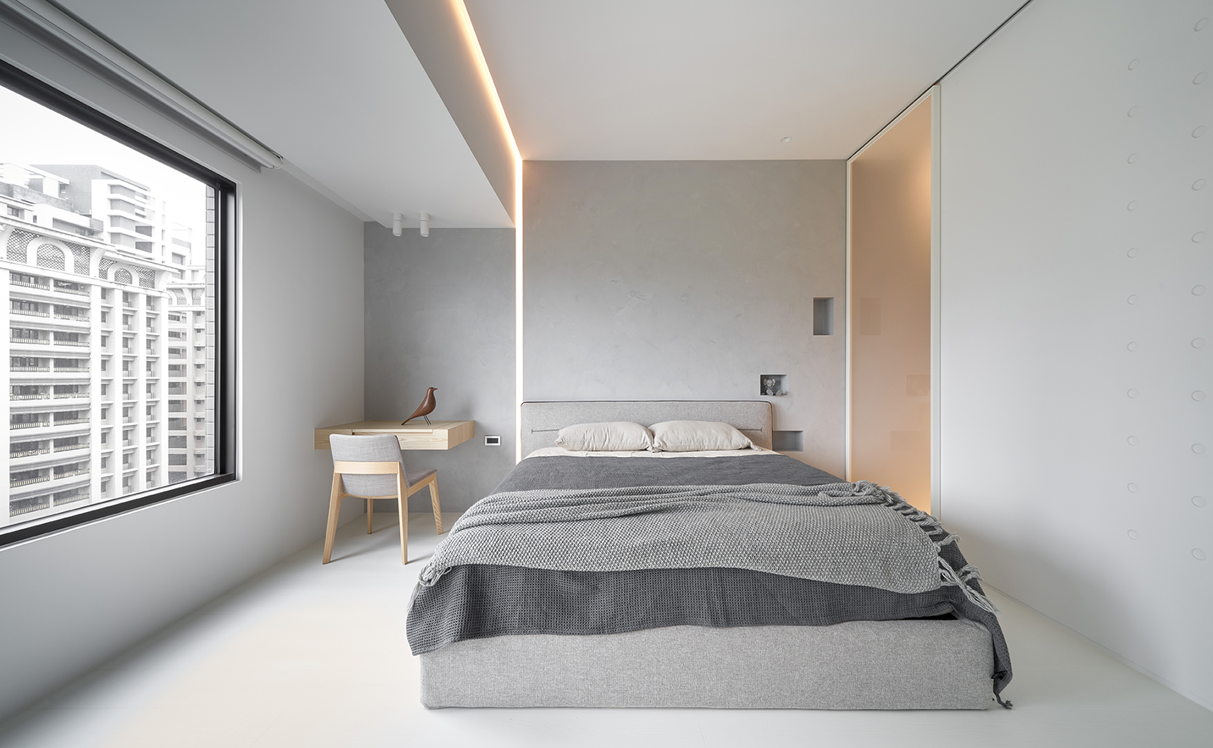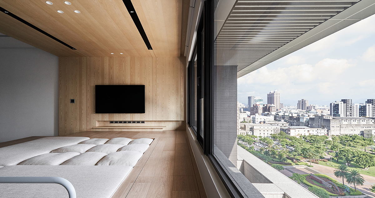 针对不同屋高处装设一道光条,勾勒层层序列的卧房格局,将视觉展延至户外,定调深邃视感。