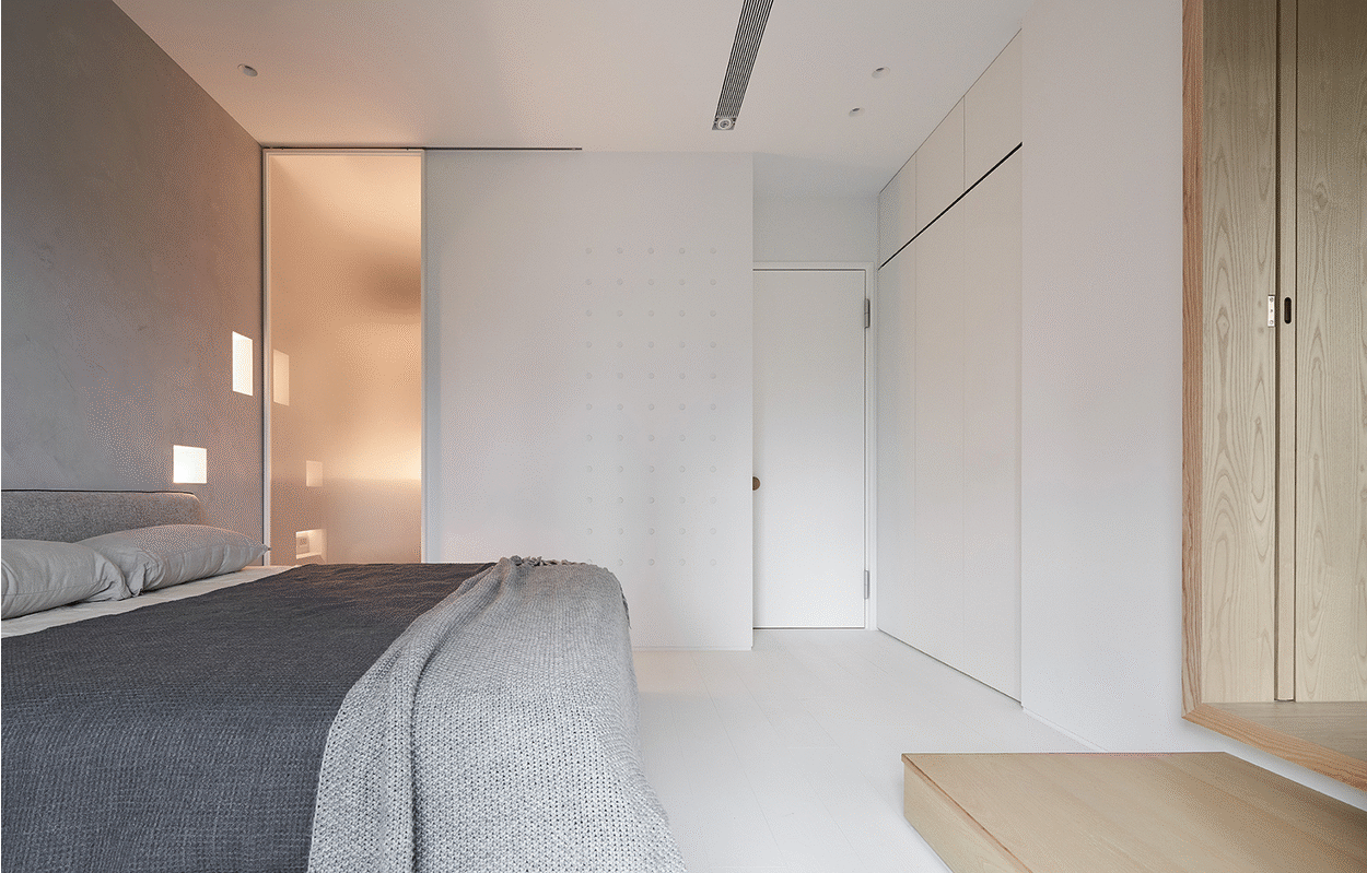 背墙采用灰泥镘抹,构筑恰似云彩流动质感,并增置方孔堆栈极简风格,一旁以滑门加以区隔更衣室,运用雾面玻璃微透光感,隐约围塑柔和气氛。