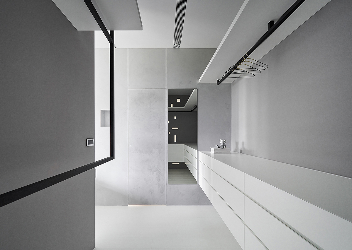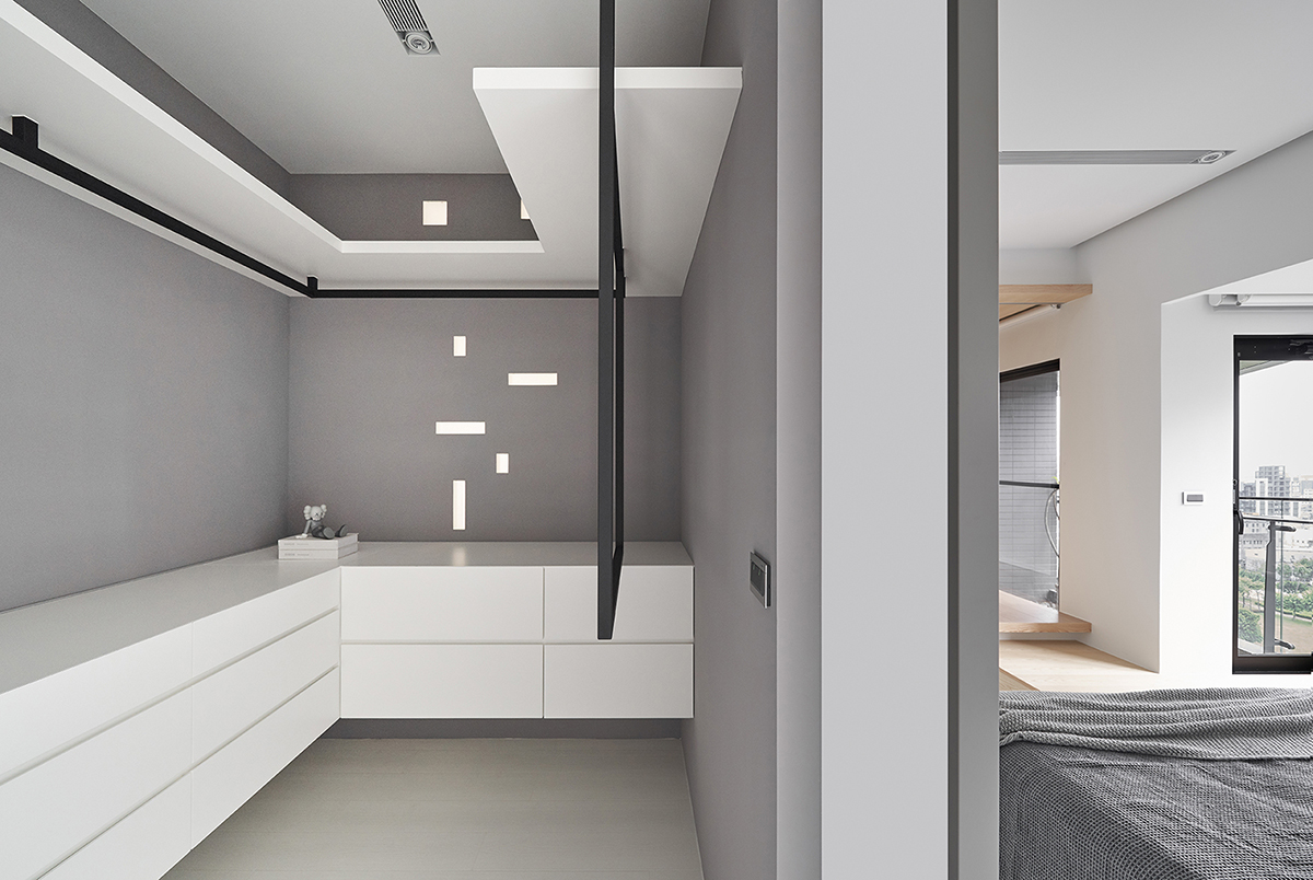 更衣室刻意挑选较深的色彩,续用灰泥构筑整体范围,而与之连结的主卫浴入口,则隐藏于灰色壁面之中,无形延伸空间尺度,再经由走廊尽头错落方孔洞端景,加以烘托盒里盒外的空间错觉。