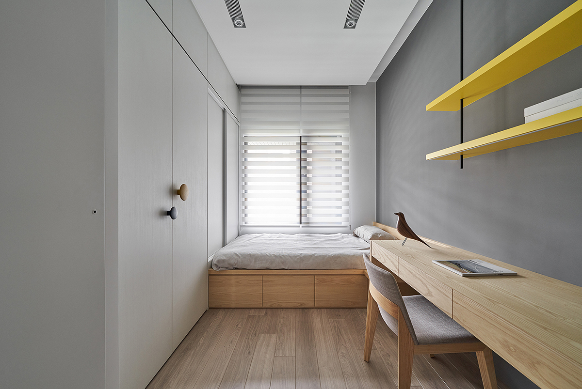 基于小孩房坪数不大,壁面利用深浅灰色铺叙空间层次,并安排置顶落地衣柜勾勒方正格局,于有限空间下,让床架结合收纳机能。