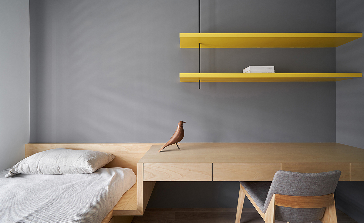 一体成型地接续床头与书桌设计,予以木质调的温厚舒心,一侧添置耀眼的莱姆黄书架,点缀生动趣味。