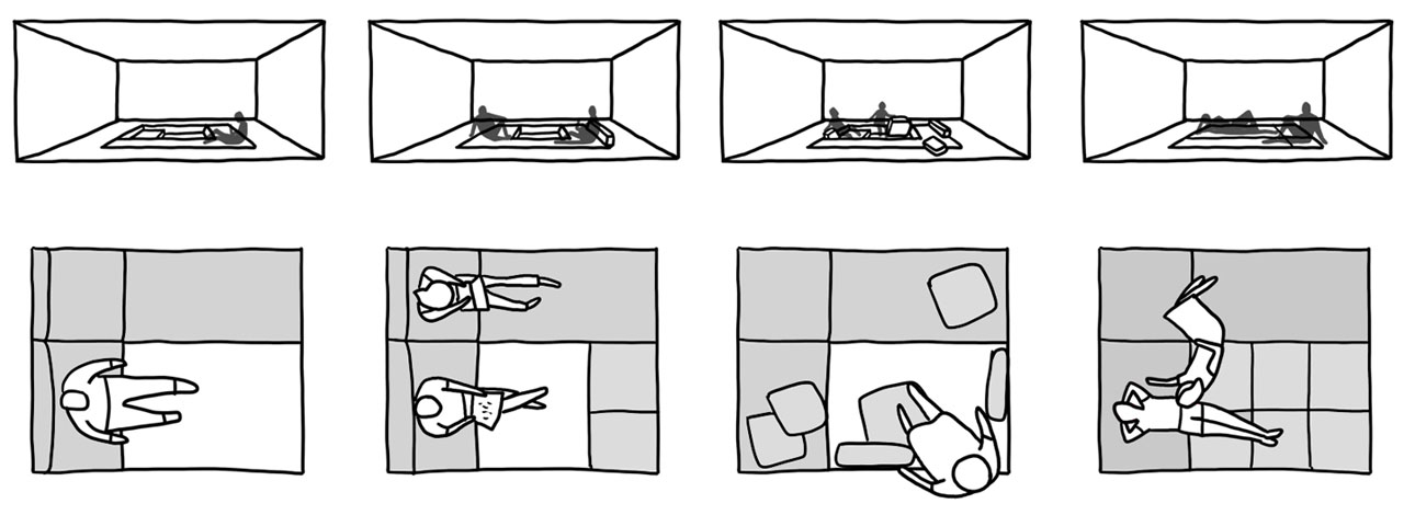 木盒内部鉴于孩子需要一个能够游戏空间,将之结合凝聚家人情感的客厅,特别规划一处下沉式区域,凭借不同高度特性,提出豆腐概念的大小软垫,捏塑可坐可躺的中介空间。