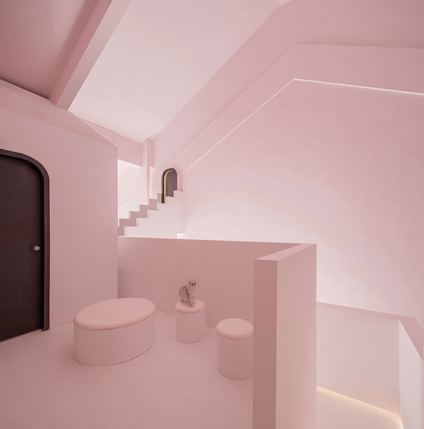 两者分别运用森林绿与木质、粉色和黑色调配出超凡的梦幻印象,渲染了远离尘嚣般的静谧,同步敞开挑高结构,透过虚实交织的楼梯与门窗,扭曲空间感