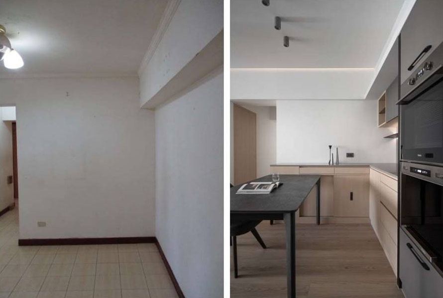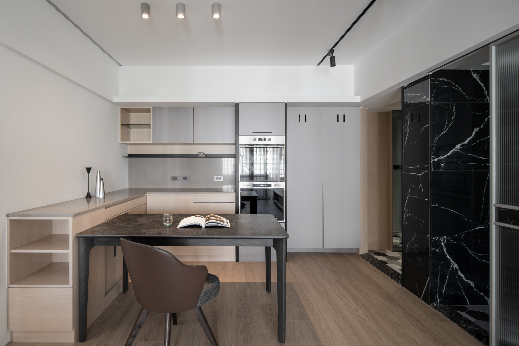 厨房是家庭的心脏,因此我们致力于打造一个既美观又实用的厨房。机能被巧妙地隐藏在美感之中,充分利用了有限的空间。黑灰白的颜色搭配,以及铁件与线形灯的轻重对比,形成了独特的美学。无论是做饭还是娱乐,这个厨房都非常实用。