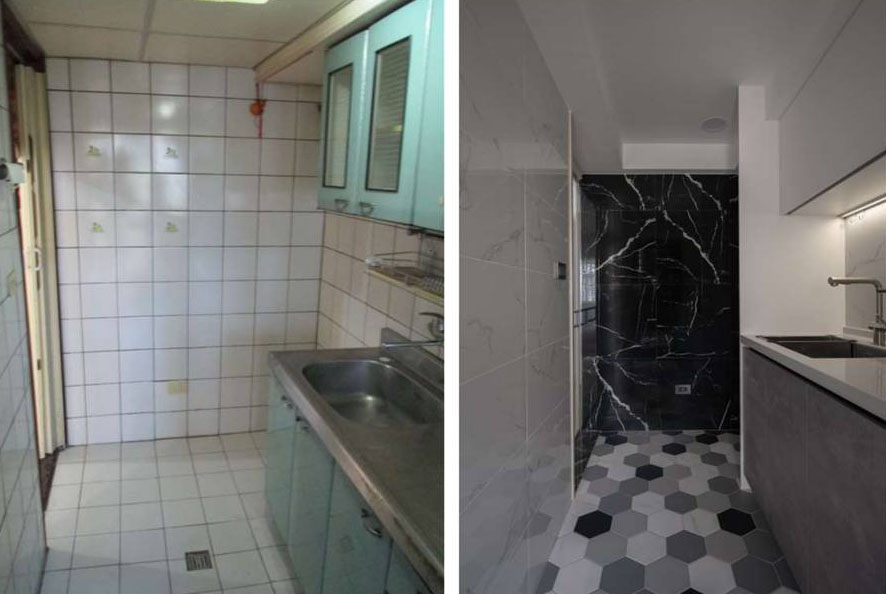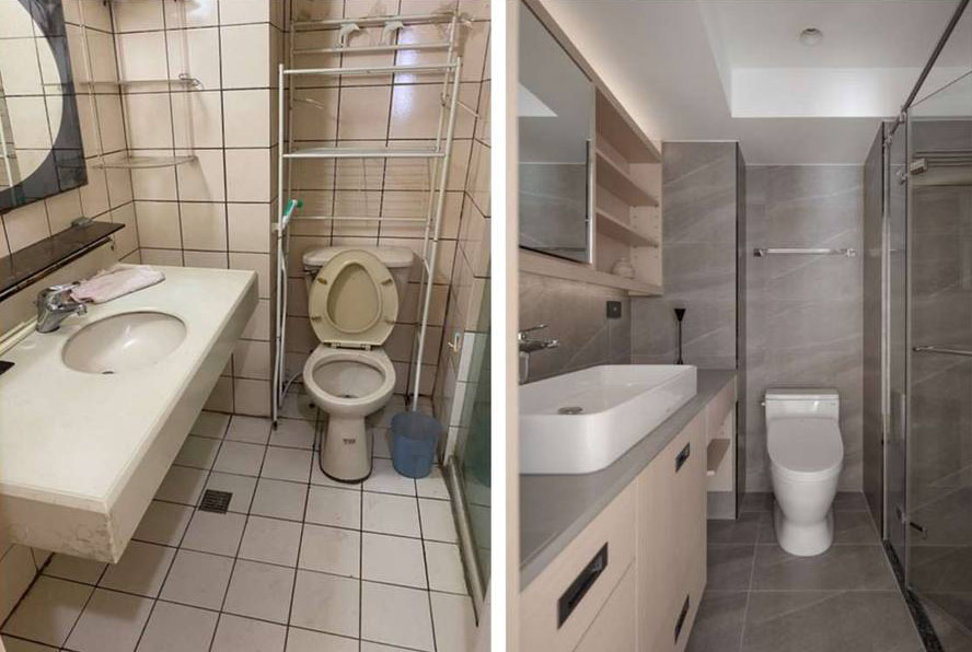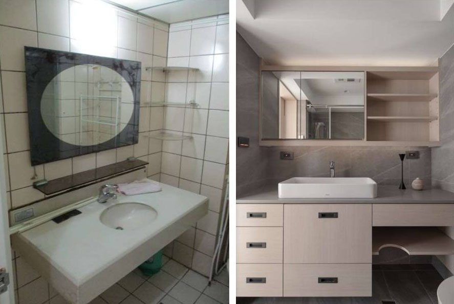 卫生间经过重新装修,增加了更多的收纳空间。各种形式和颜色的层叠橱柜减少了压迫感,同时满足了收纳需求。粪管没有移位,以避免地板垫高。镜柜的增设进一步增加了收纳空间。