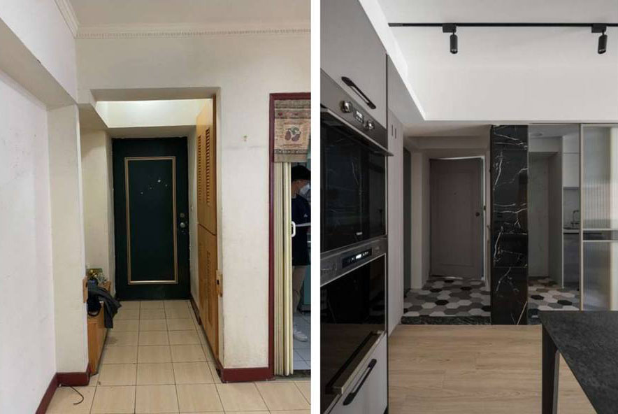 玄关是家的第一印象,因此我们采用了六角码铺的地面,与厨房地面一致,以扩大视觉感受。这个区域成为了整个居住空间的迎宾区,为整个家增添了独特的氛围。