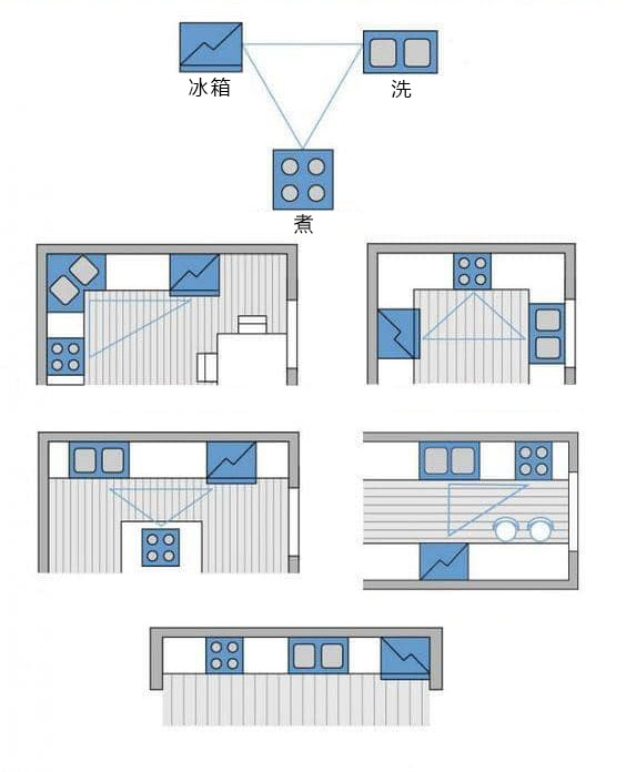 设计时考虑工作三角,包括冰箱、炉灶和水槽的位置。这些元素应该在厨房中形成一个便于工作的三角形,以提高工作效率。