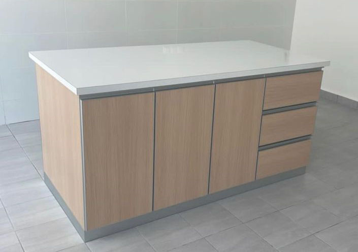 如果空间允许,您可以考虑在L型厨房中加入一个中岛。中岛可以用作额外的工作台面、用餐区域或社交空间。确保中岛的尺寸和高度与L型厨房相协调。