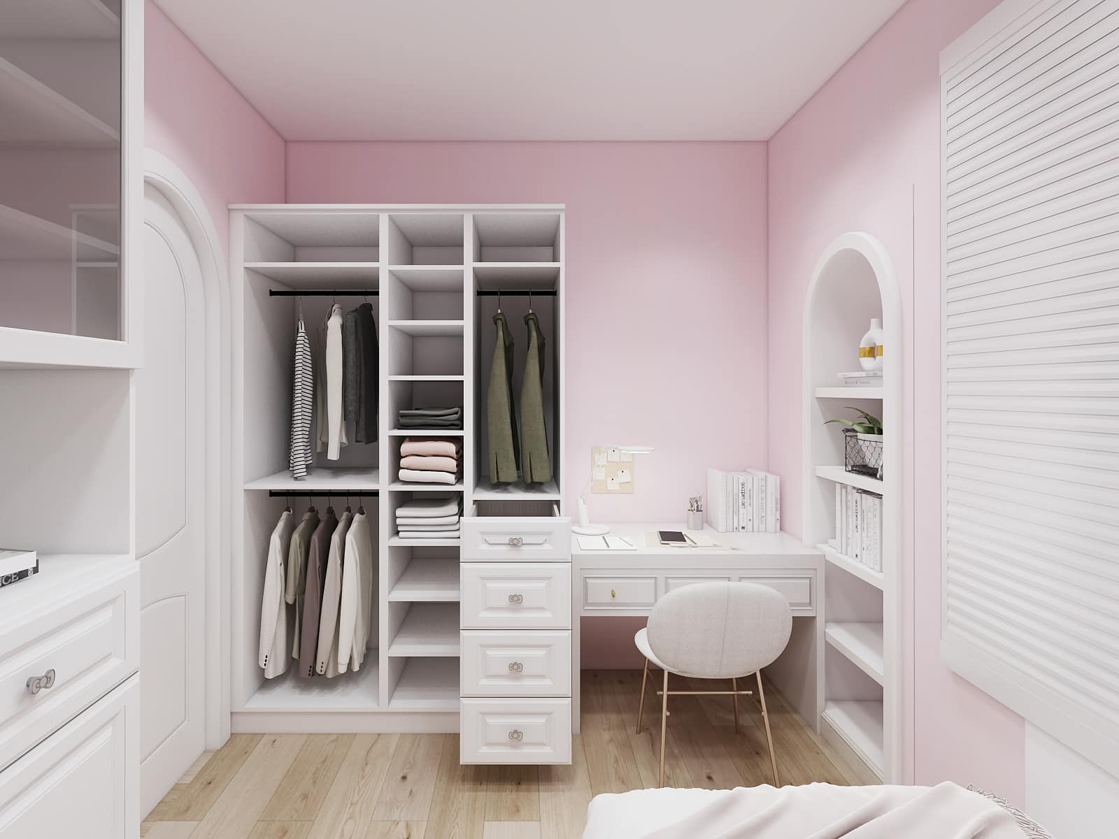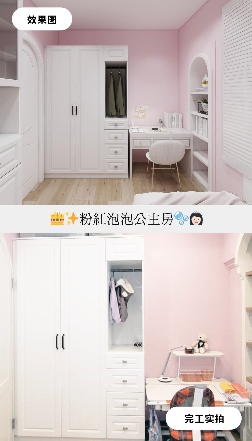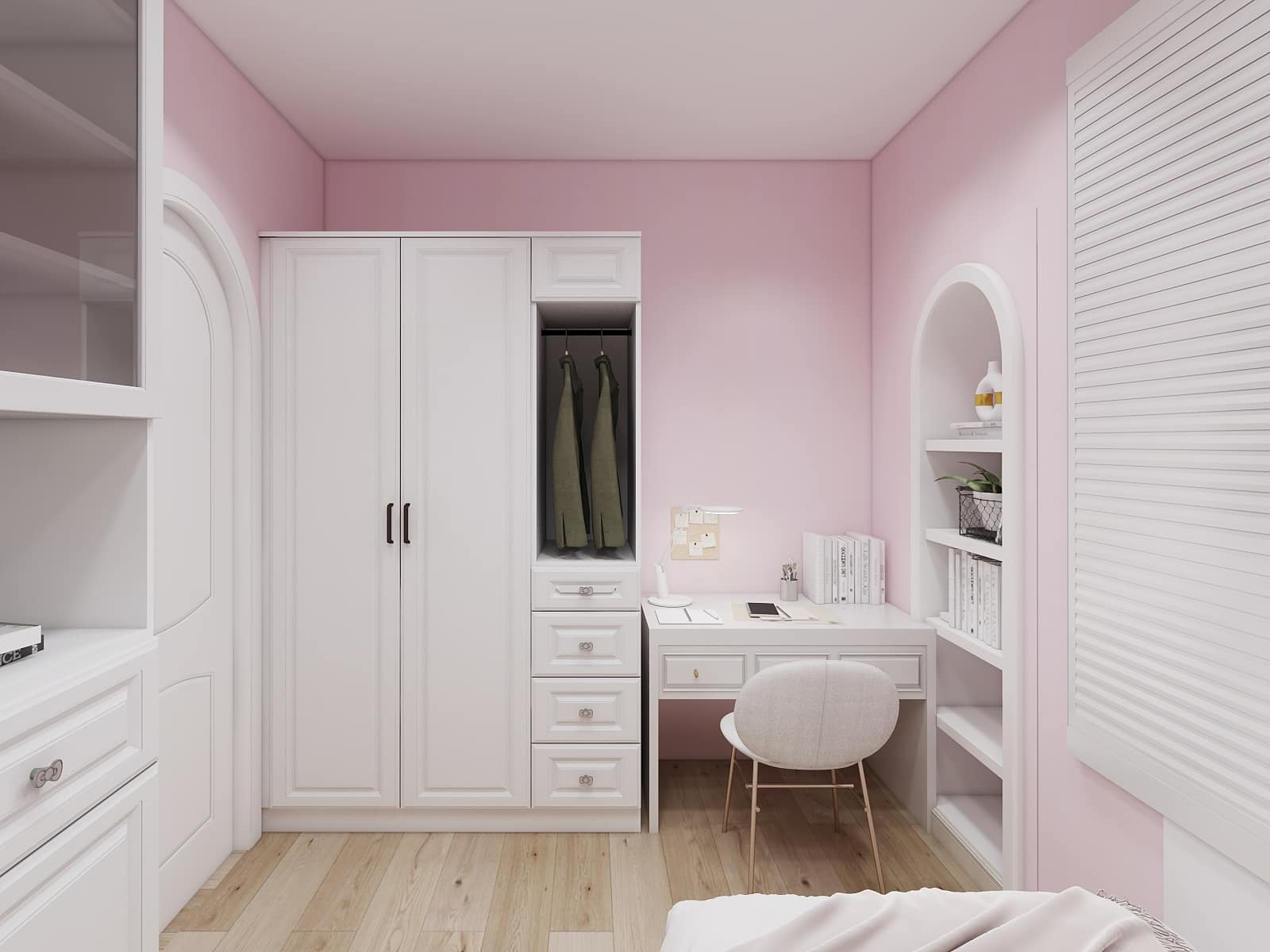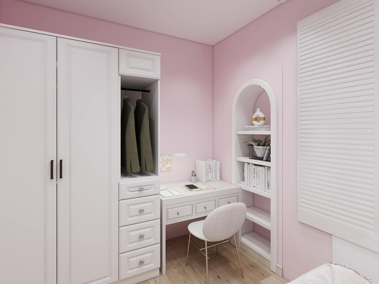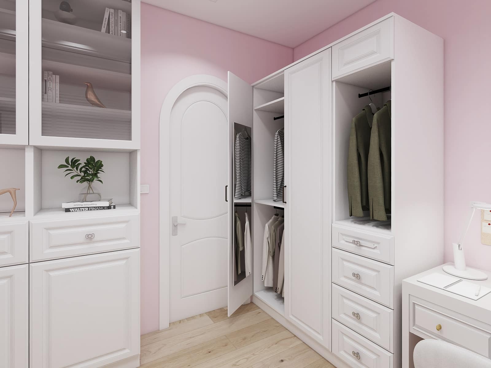 在童趣世界里增添几分趣味,衣柜根据需求安排了全身镜,提供穿衣搭配使用。在配置上规划了一个二次衣柜,提供换洗衣物收纳空间。