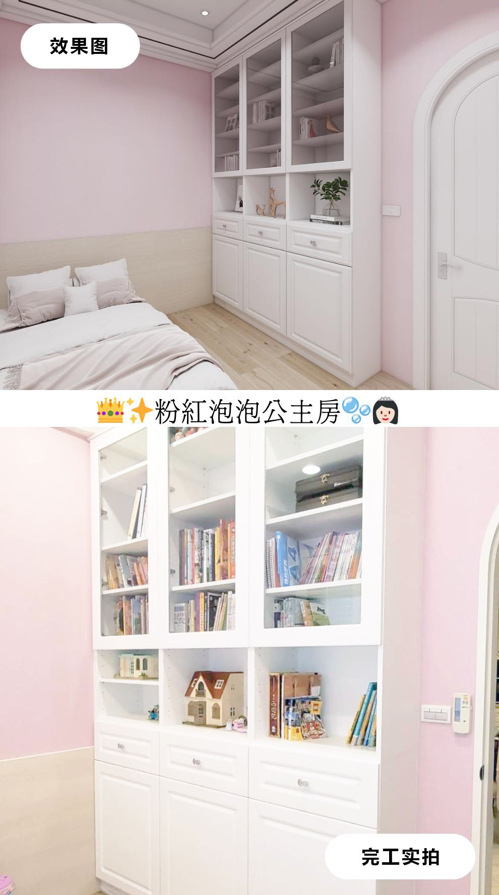 书柜中间篓空,提供放置一些益智玩具、常看的书籍,也降低了高柜压迫的感觉!