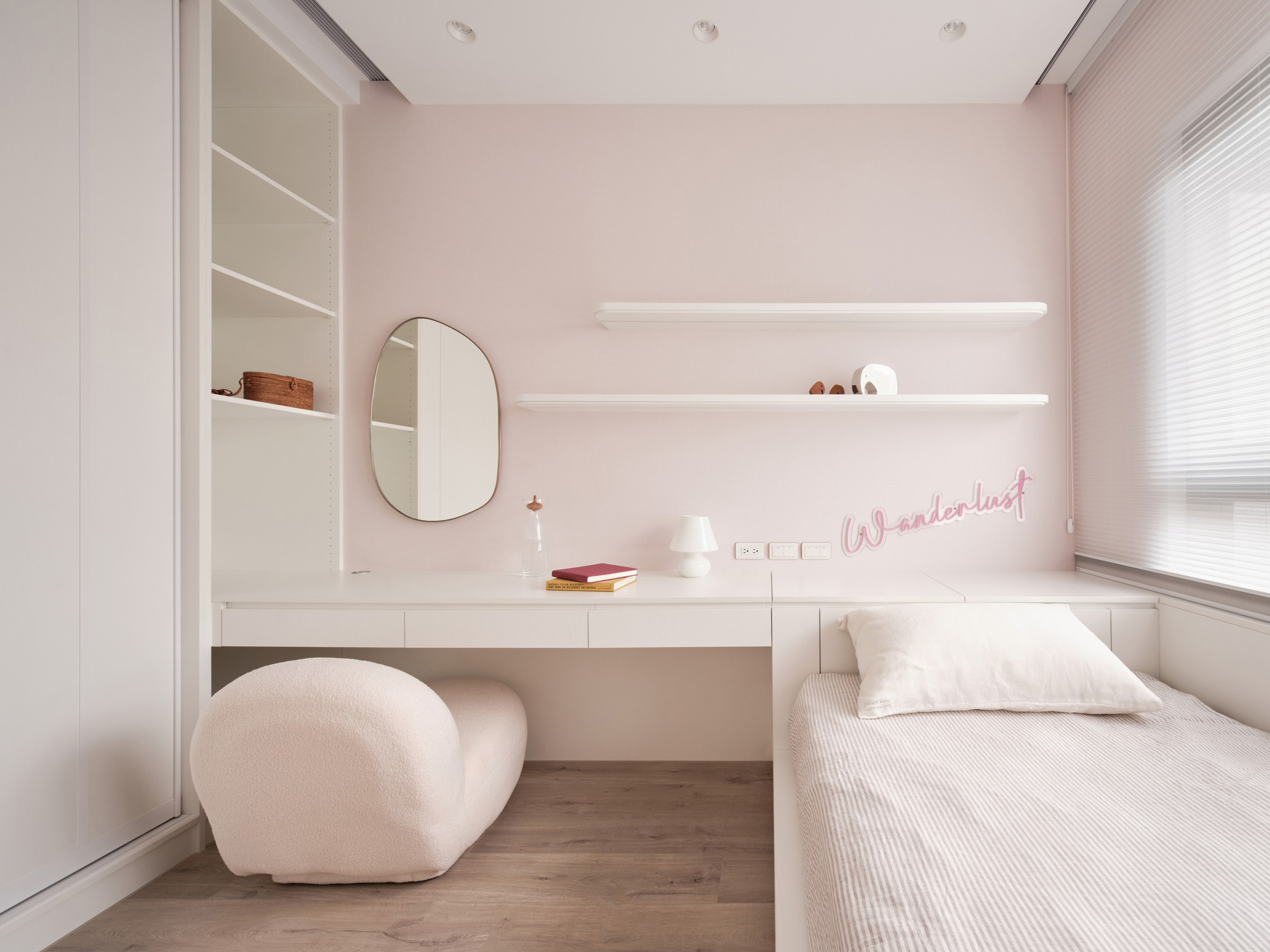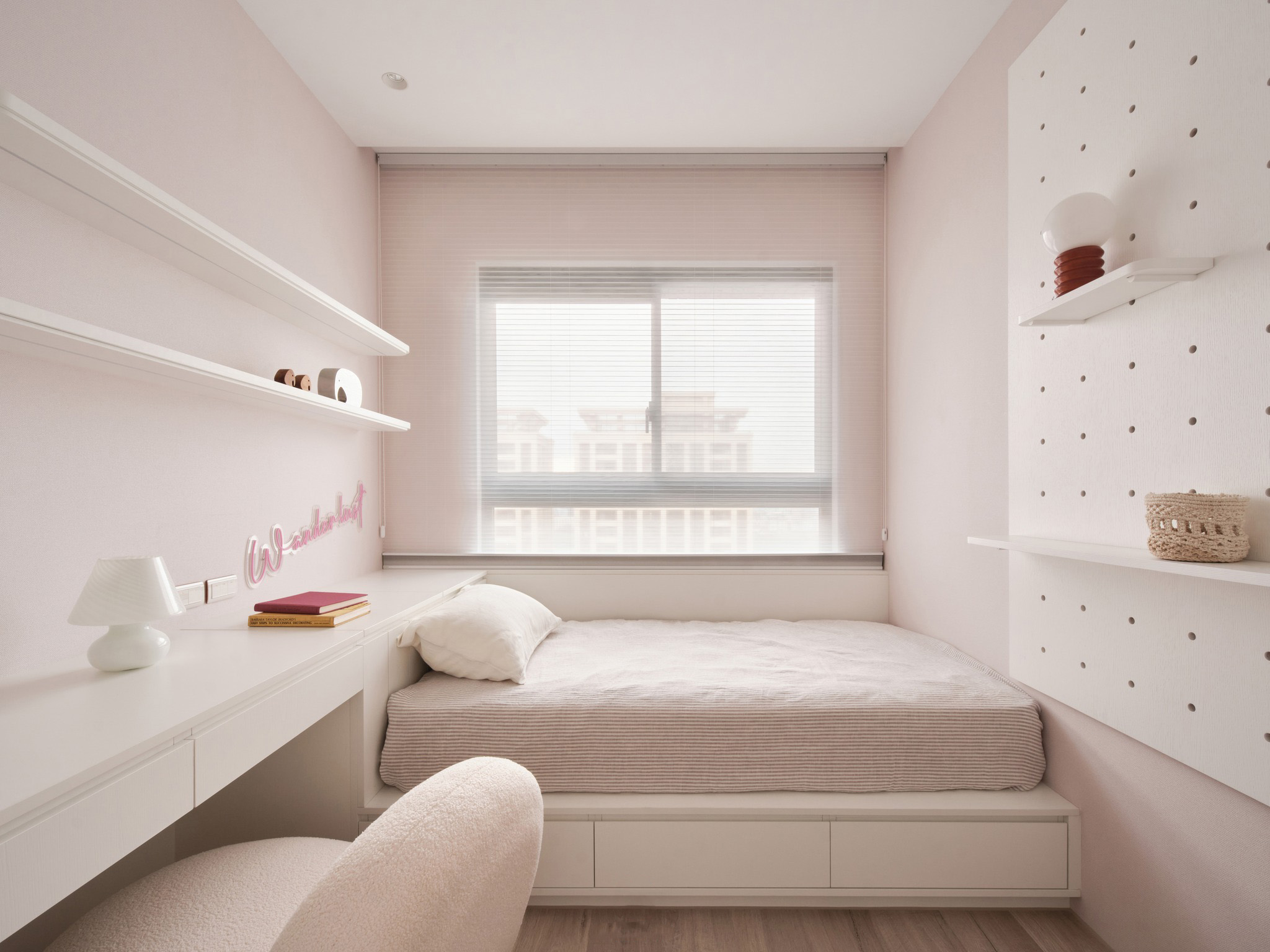 一间淡粉色的卧室,在闪烁的霓虹灯光中散发出柔美光彩;另一间白色寝室中,幽蓝灯光在空间中闪耀交辉。