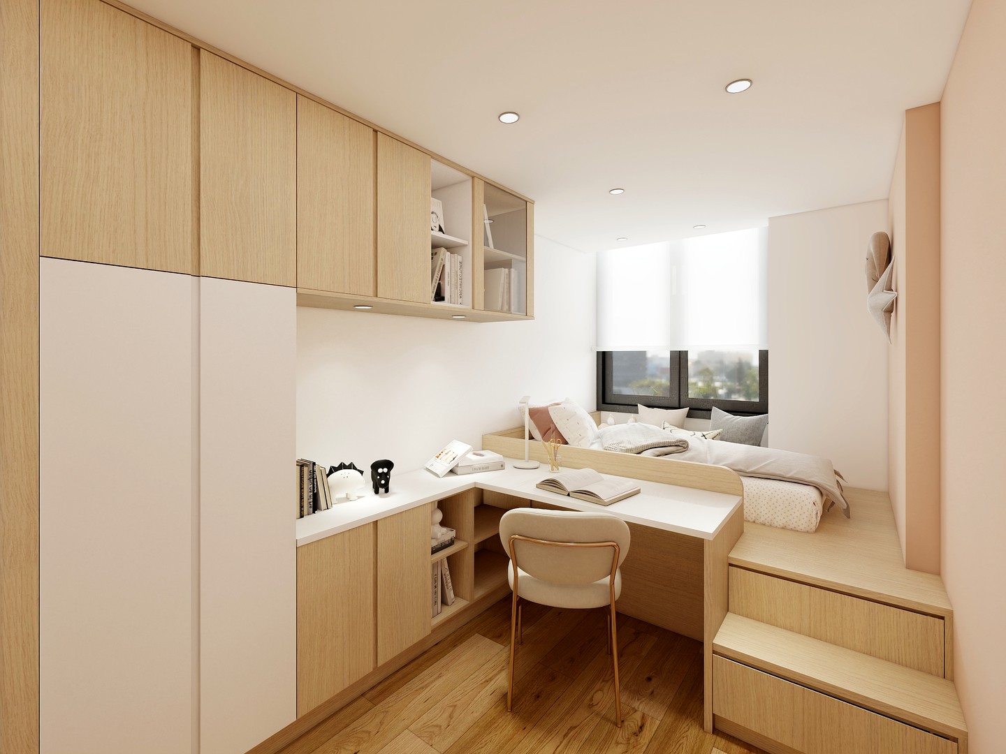 为了最大程度地利用空间,我们采用了立体设计的理念,不再将房间局限于平面生长,而是将其向上堆叠!