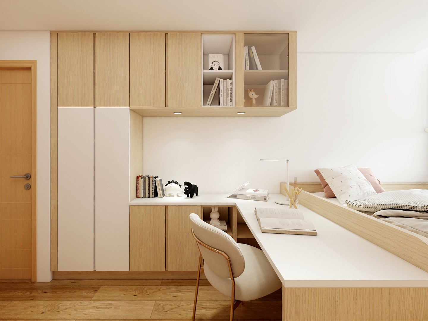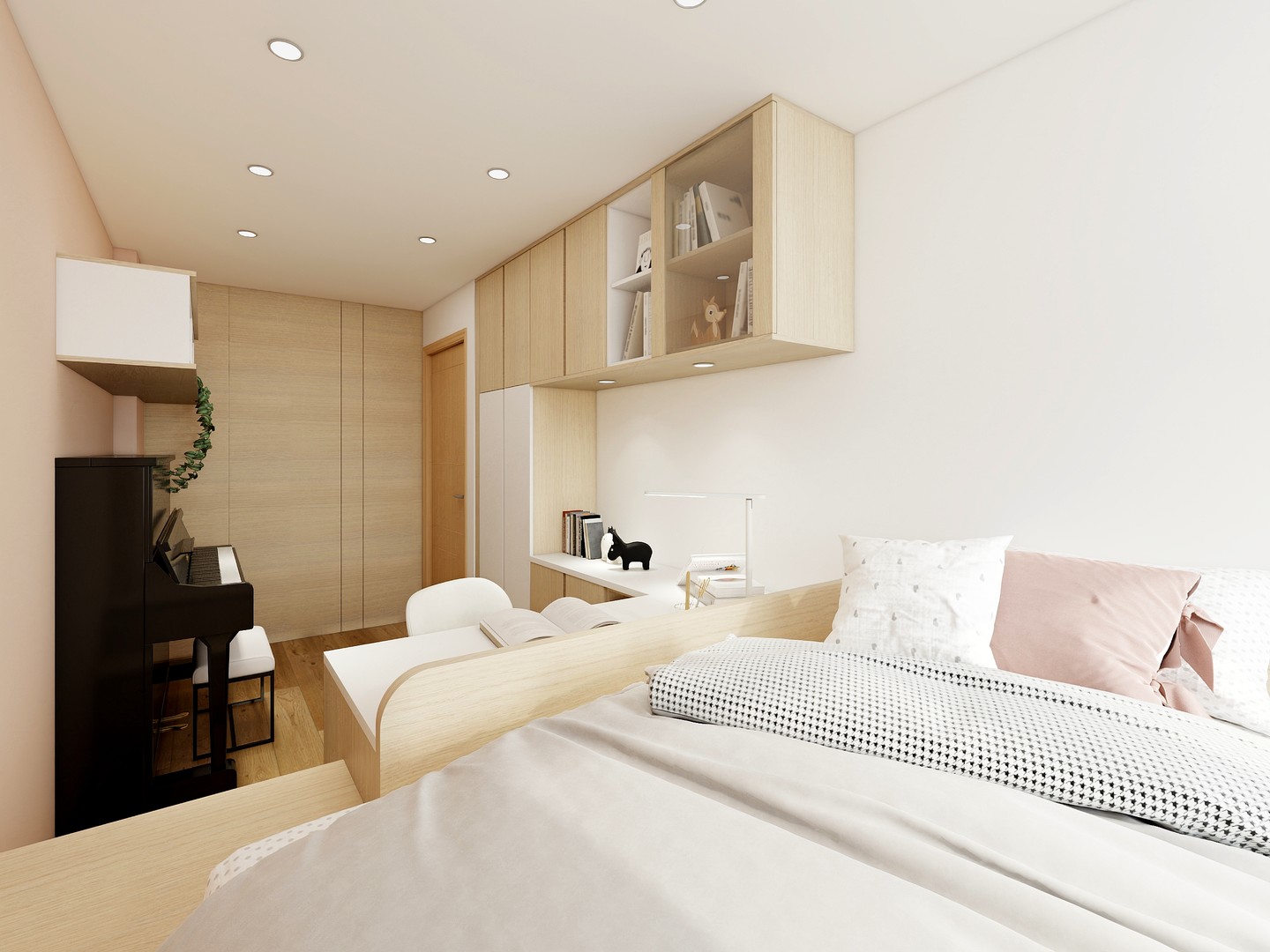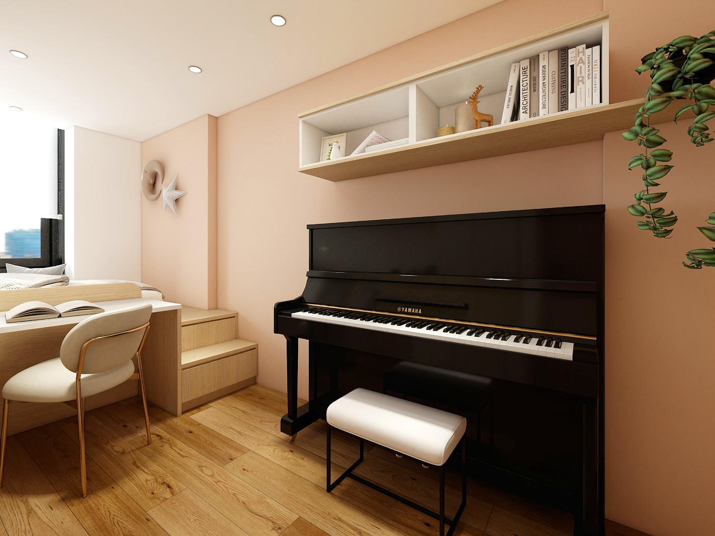 这次的房间设计以卧榻款式为主,不仅增加了更多的收纳空间,还巧妙满足了家长们对于宽敞大书桌的向往。这样一来,除了满足了儿童的需求,还为房间腾出了更多的空间,可以容纳钢琴,而不显得拥挤。