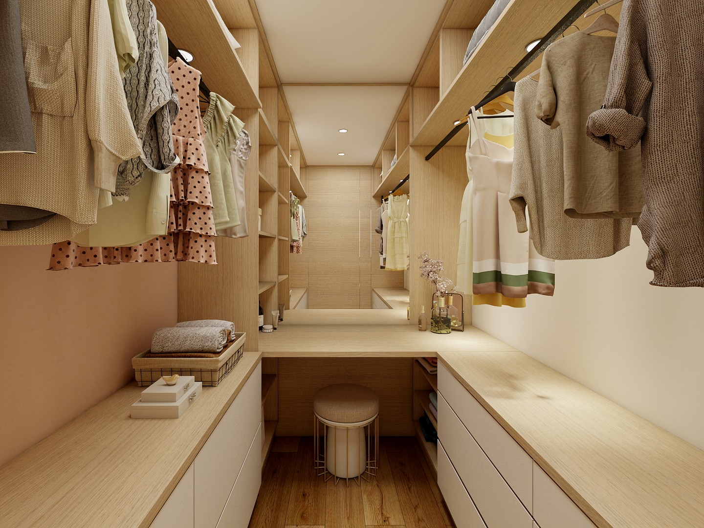 在更衣间的设计上,我们不仅增加了化妆台的部分,还将原本的衣柜改为开放式衣柜,以美化狭长空间的同时,提升了整体的视觉效果。