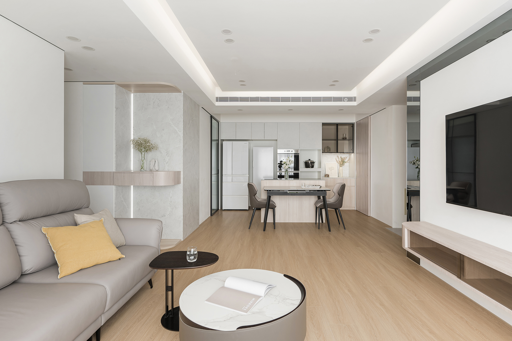 采用原木色地板,与整体色调搭配,打破单调感。家具选用简洁线条的原木色家具,如淡灰色沙发、茶几,营造宽敞的客厅空间。