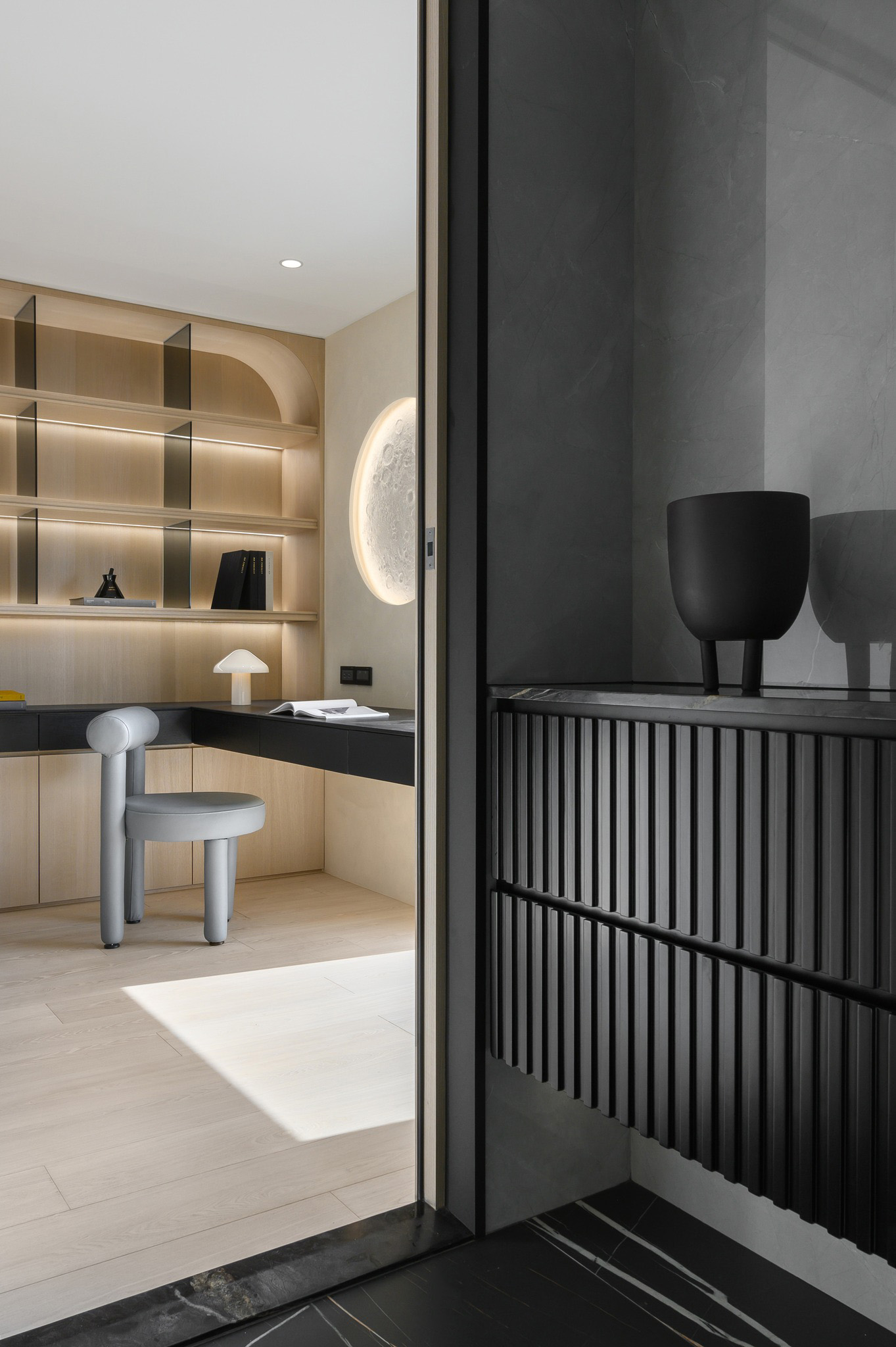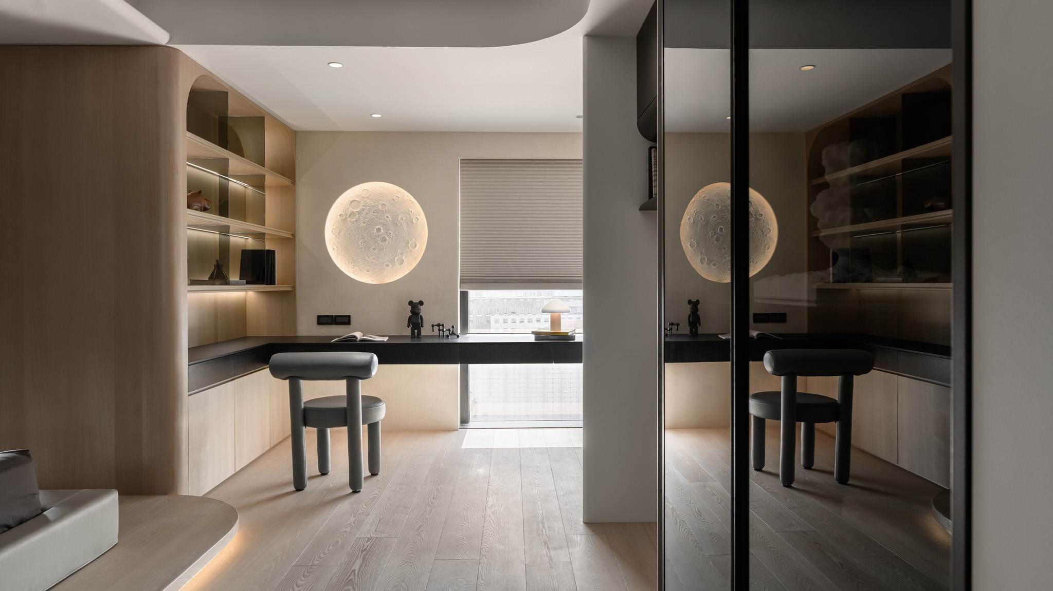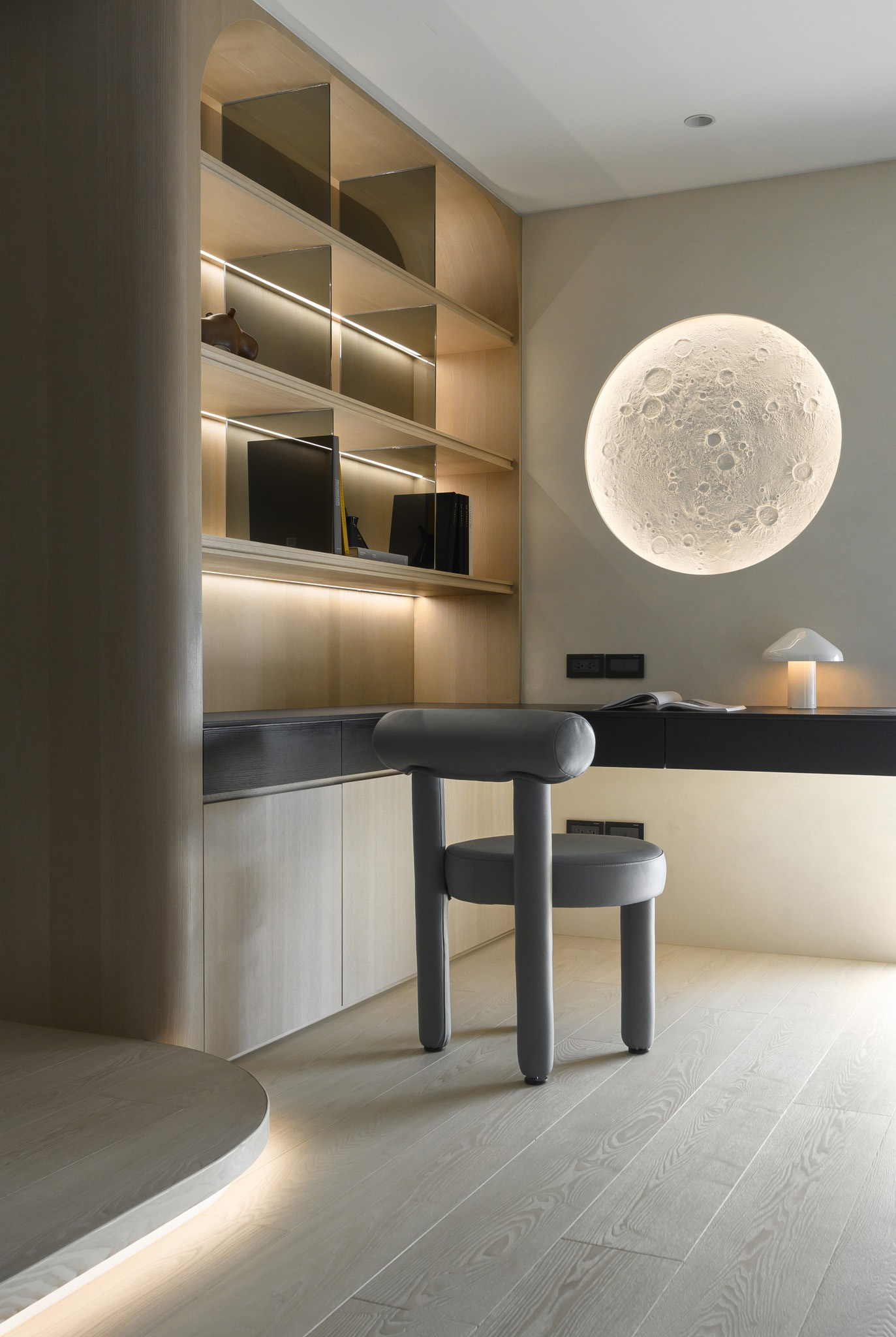 在这个卧室的设计中,一抹神秘的月球灯将整个空间注入了一份梦幻的色彩。这个灯具不仅仅是照明的工具,更是一种独特的装饰元素,为卧室增添了一份与众不同的韵味。