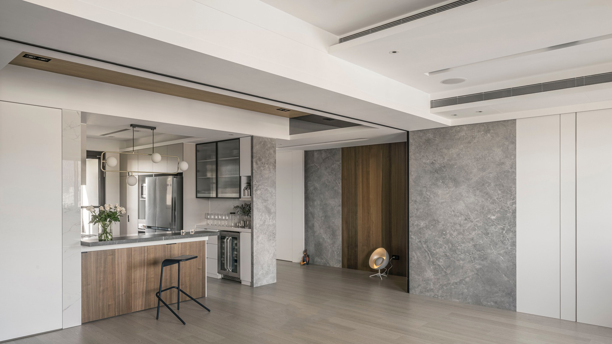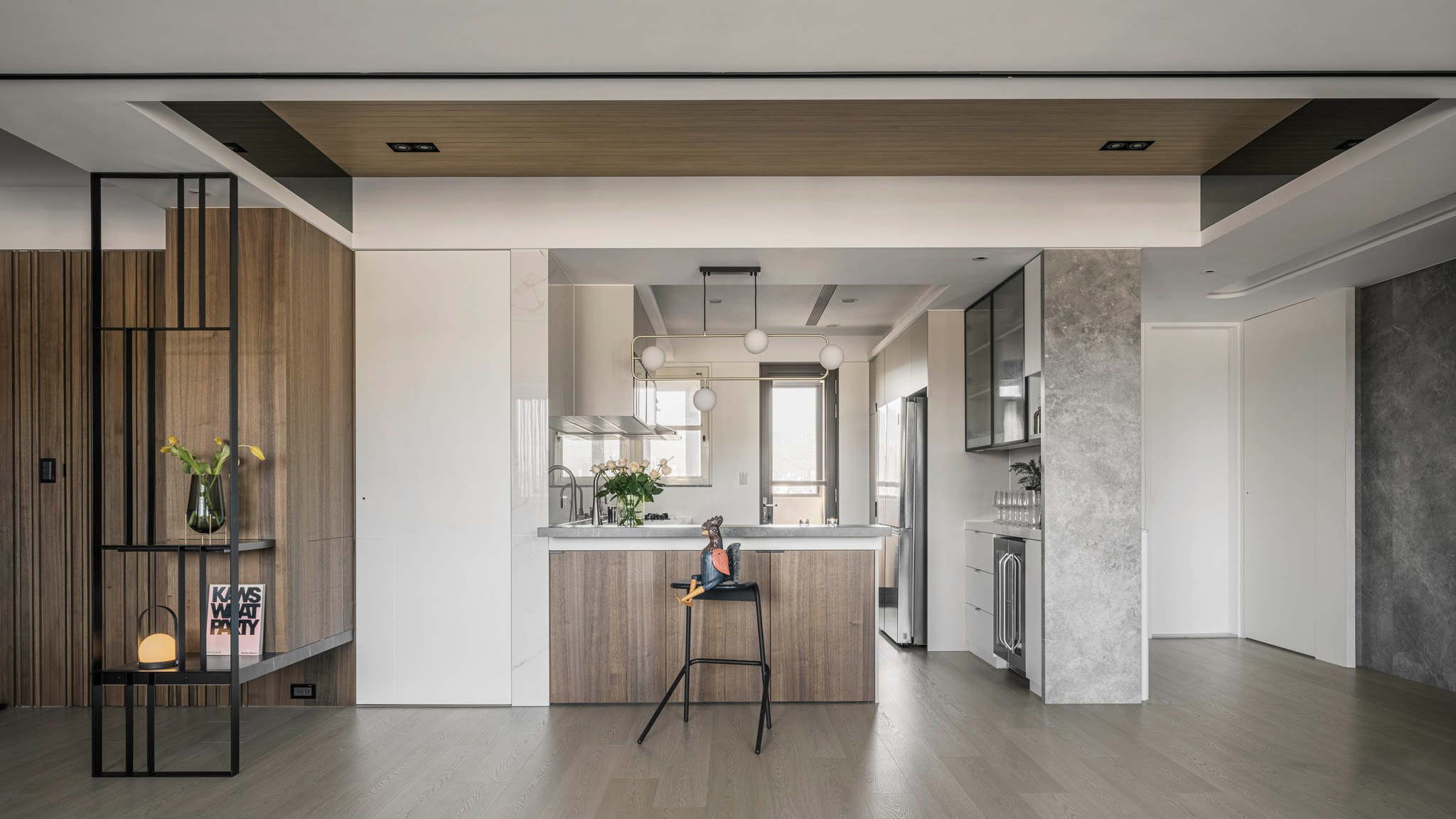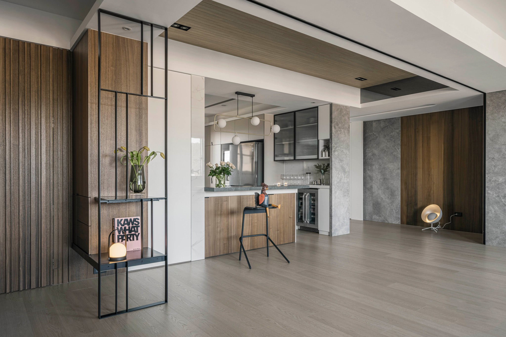 整体空间以温润的深色木纹和石墙为主轴,展现了内敛沉稳的中性基调,与业主深思熟虑的气质相得益彰。整齐划一的空间线条和梁柱的镜面材质,搭配简洁利落的造型铁件,奠定了理性的空间语汇,同时展现出大气、开阔的视觉意象。