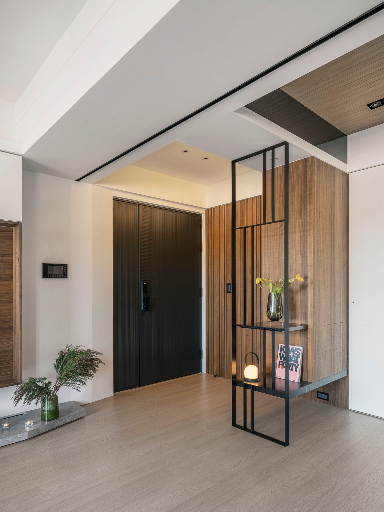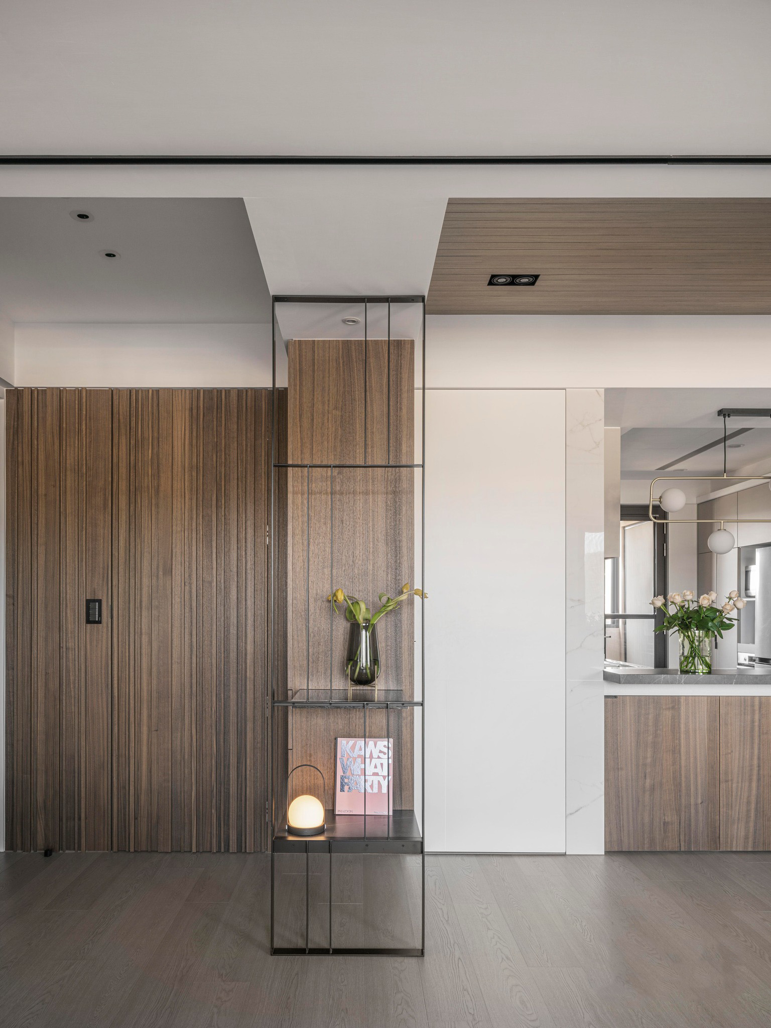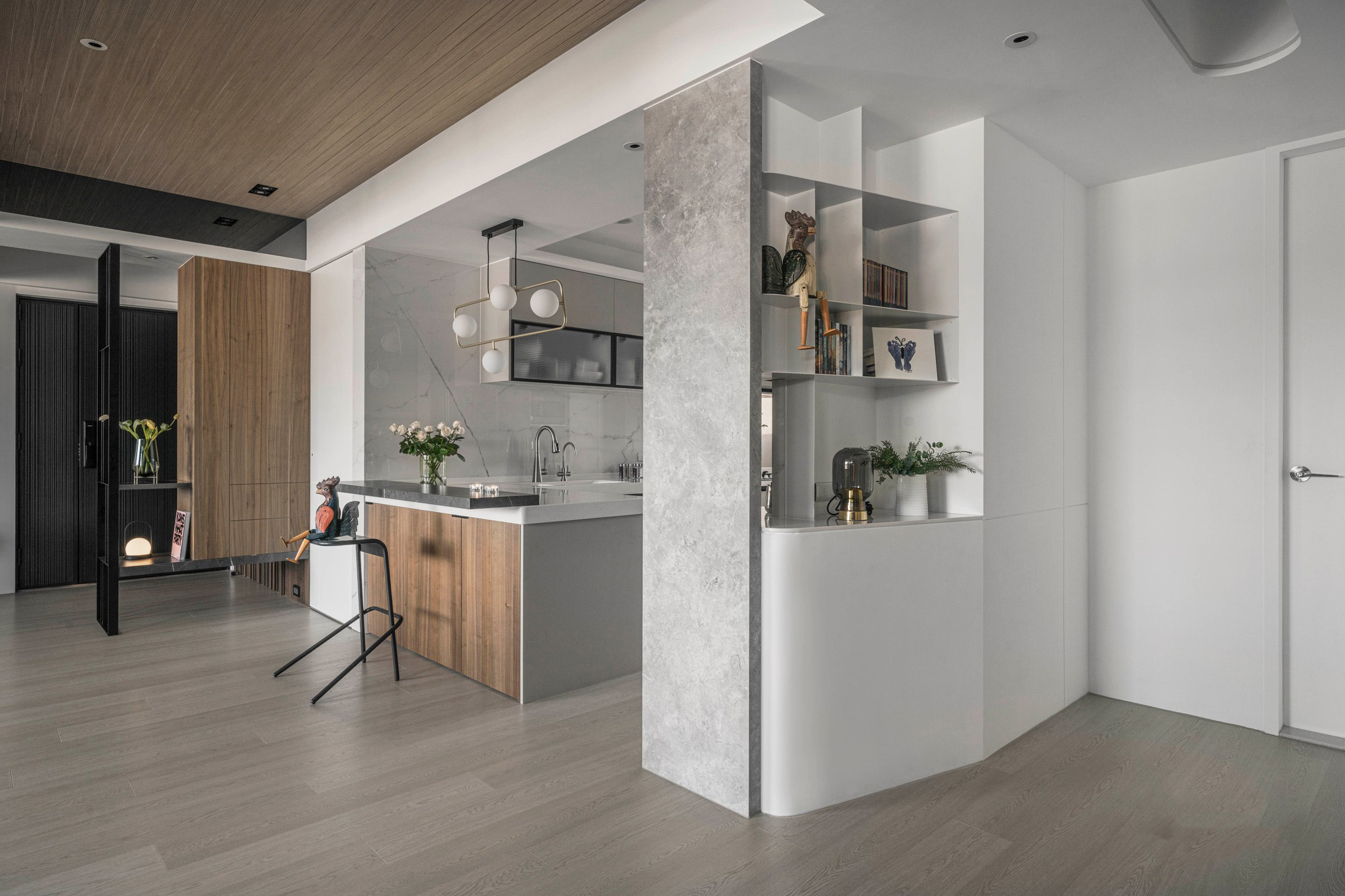 整体空间以温润的深色木纹和石墙为主轴,展现了内敛沉稳的中性基调,与业主深思熟虑的气质相得益彰。整齐划一的空间线条和梁柱的镜面材质,搭配简洁利落的造型铁件,奠定了理性的空间语汇,同时展现出大气、开阔的视觉意象。