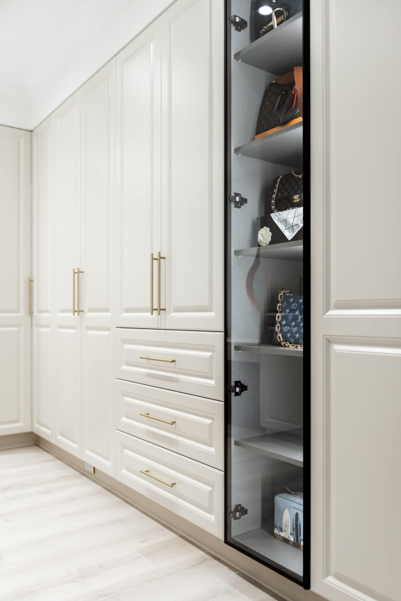玻璃门的包包柜和饰品柜展现了对细节的精致关照。透明的玻璃门不仅将包包和饰品呈现得清晰可见,还为空间增加了一份轻盈感。每一款包包和饰品都如艺术品般摆放其中,使整个空间呈现出一种高雅的品味。