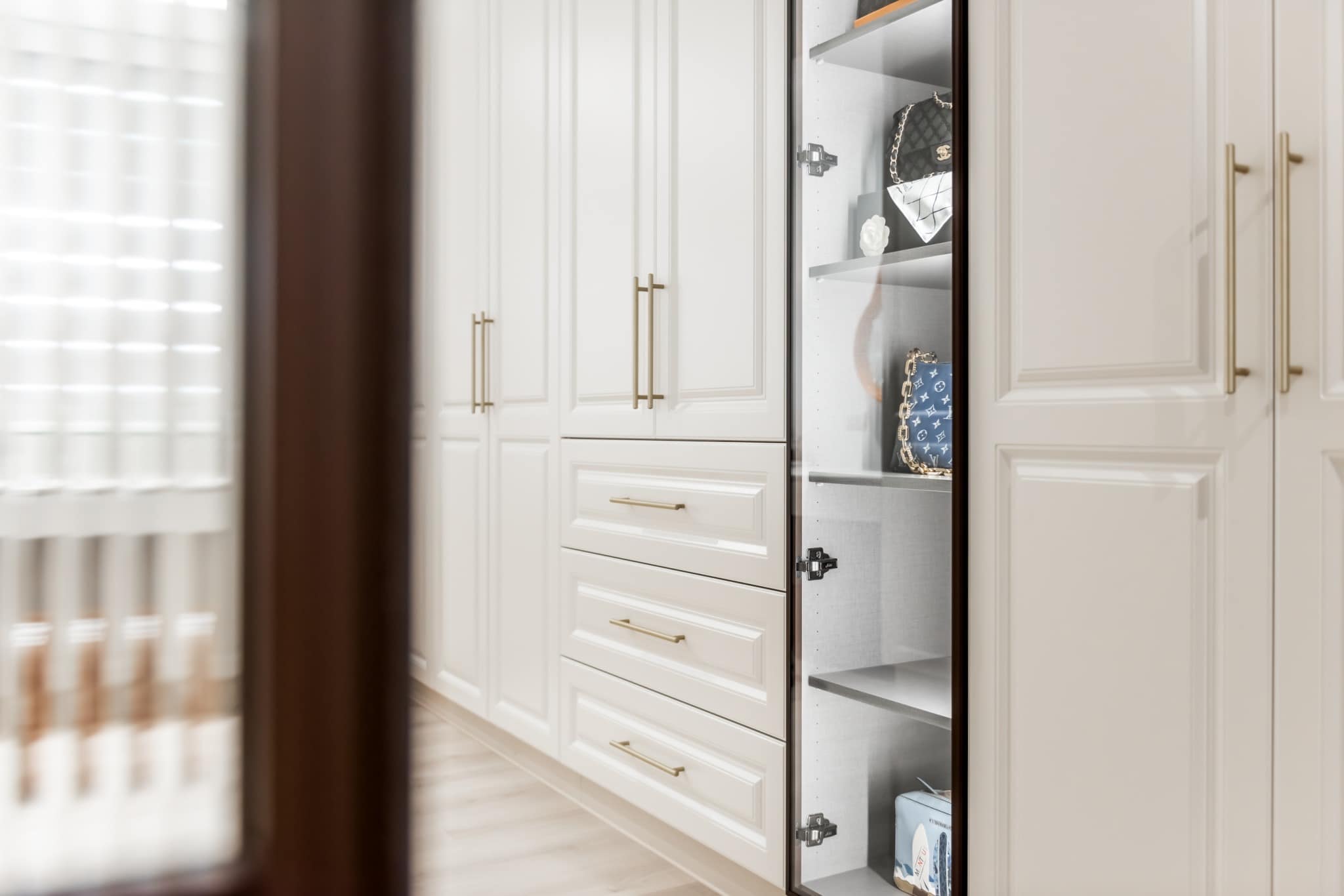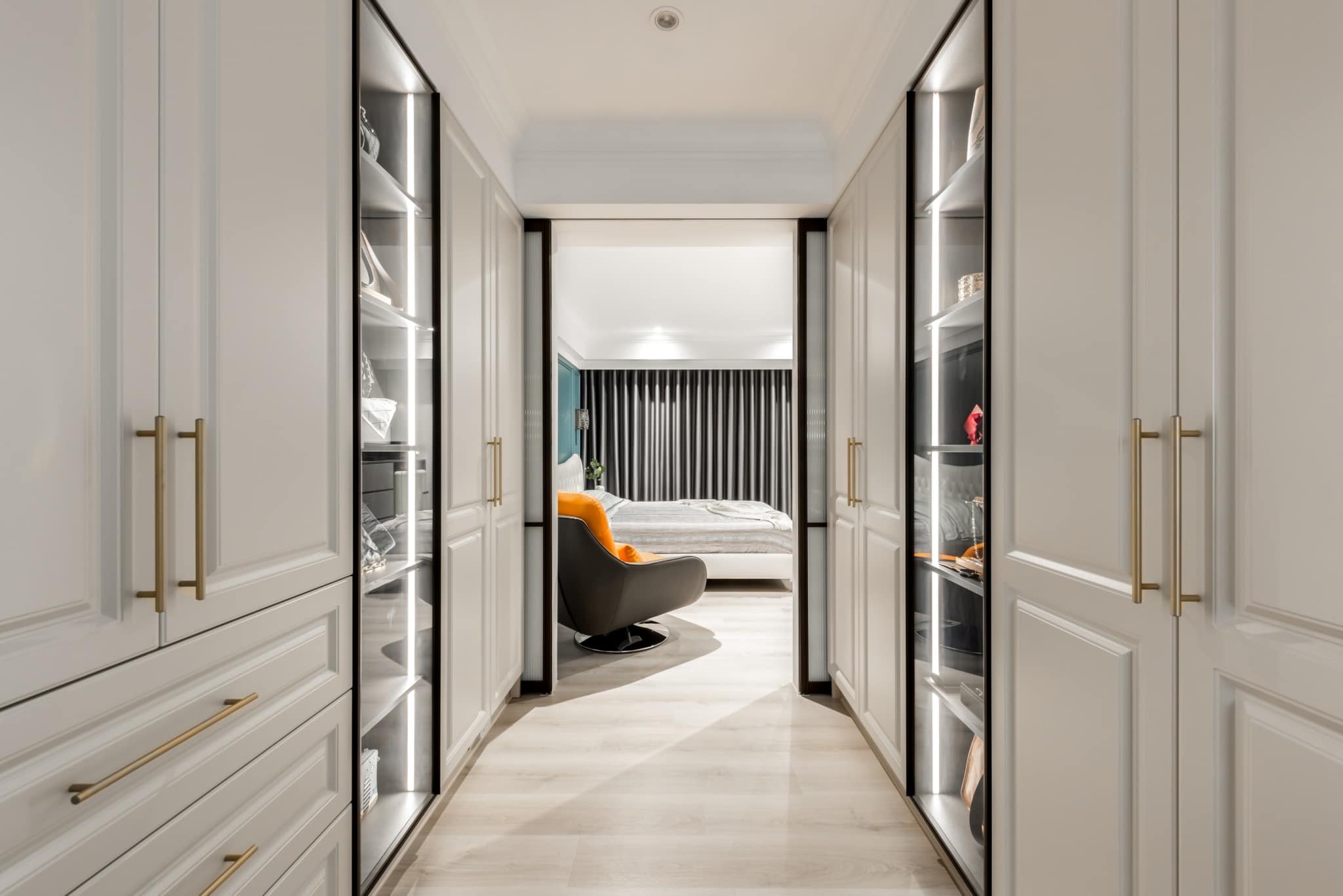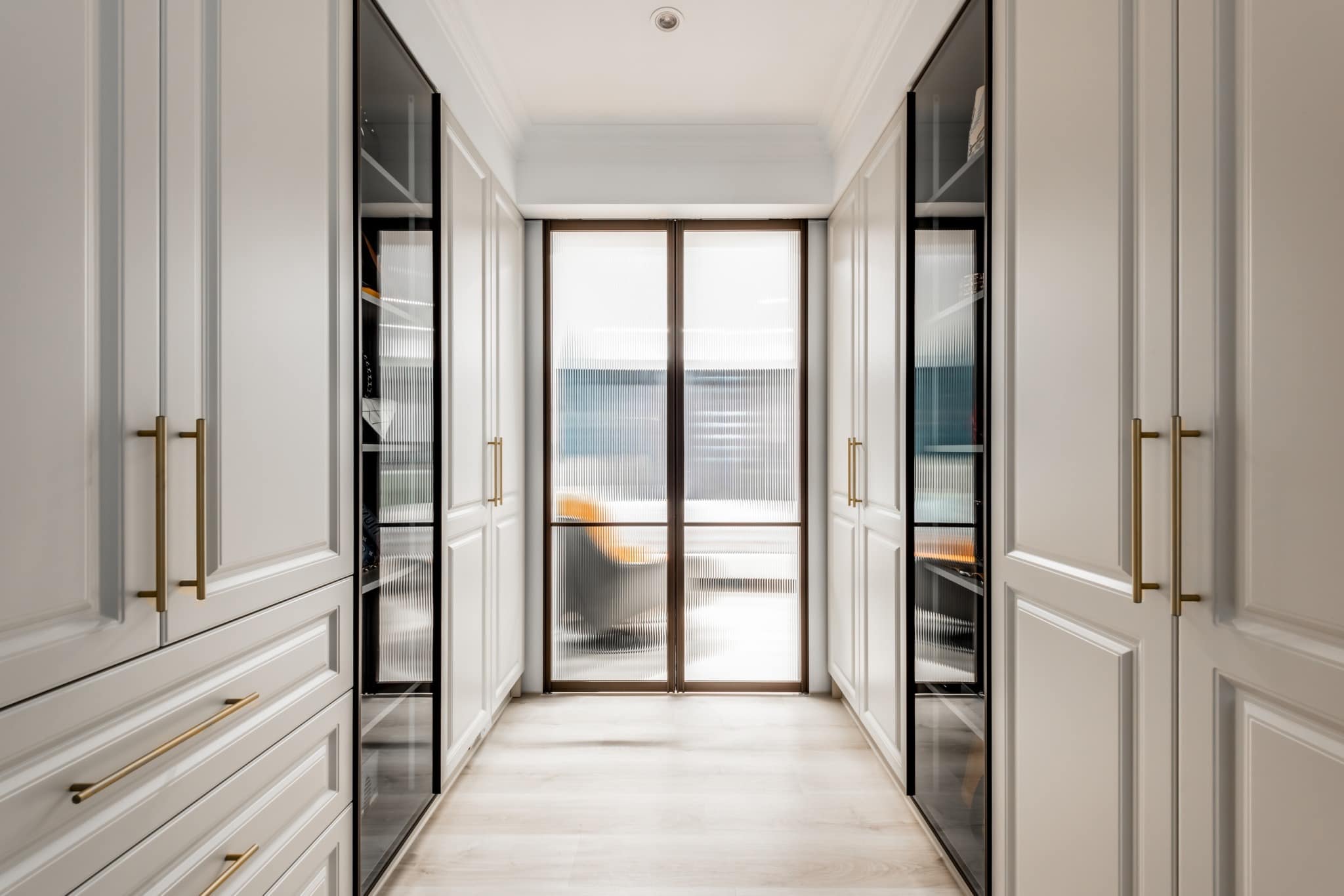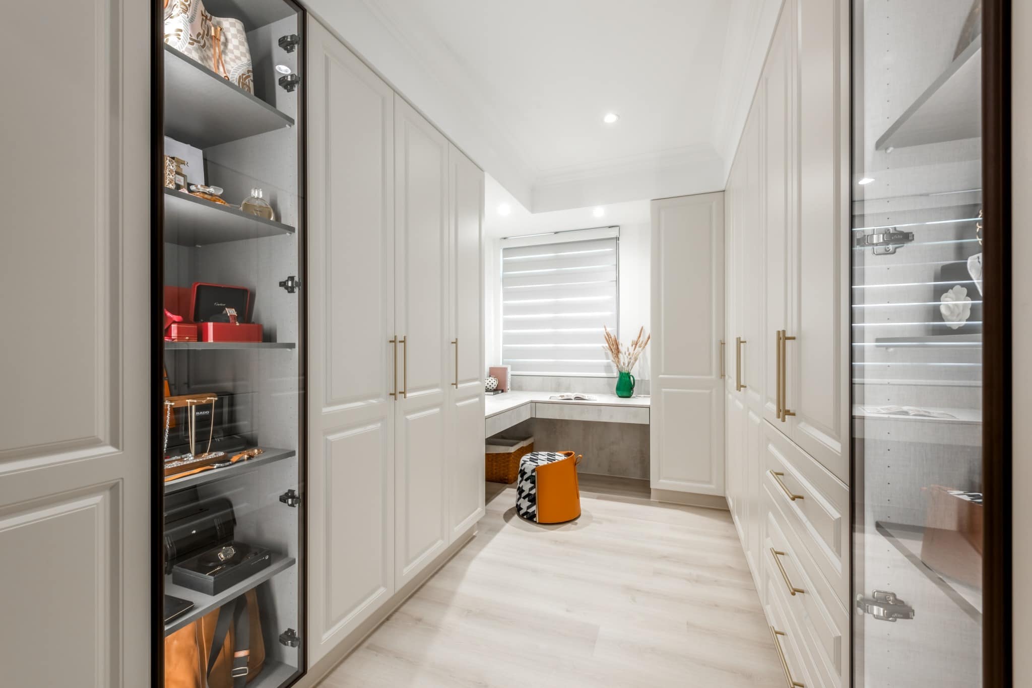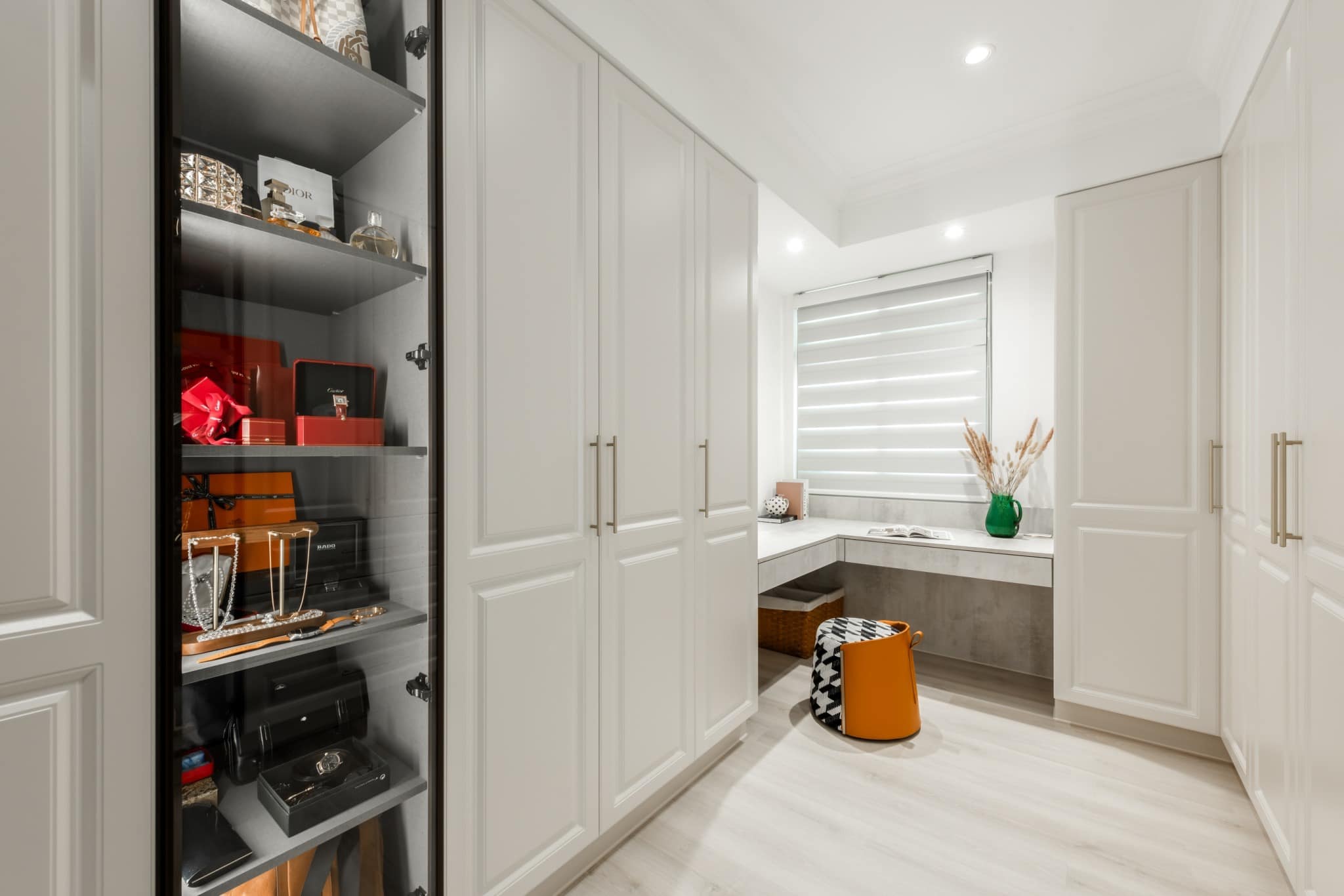 纯白的衣帽间组合柜、梳妆台、玻璃门的包包柜和饰品柜,共同构筑了一个令人陶醉的空间,将简约、优雅和实用完美融合。