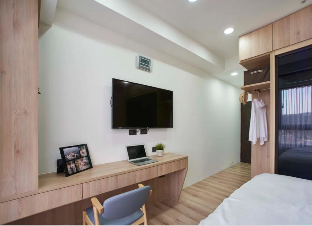 小卧室的规划需要精心考虑每一寸空间,而推拉门、悬空床头柜和床尾书桌的设计,不仅使空间合理利用,同时也为居住者带来了更为便利和愉悦的居住体验。这是一个小而巧妙的空间,充满了温馨与智慧。