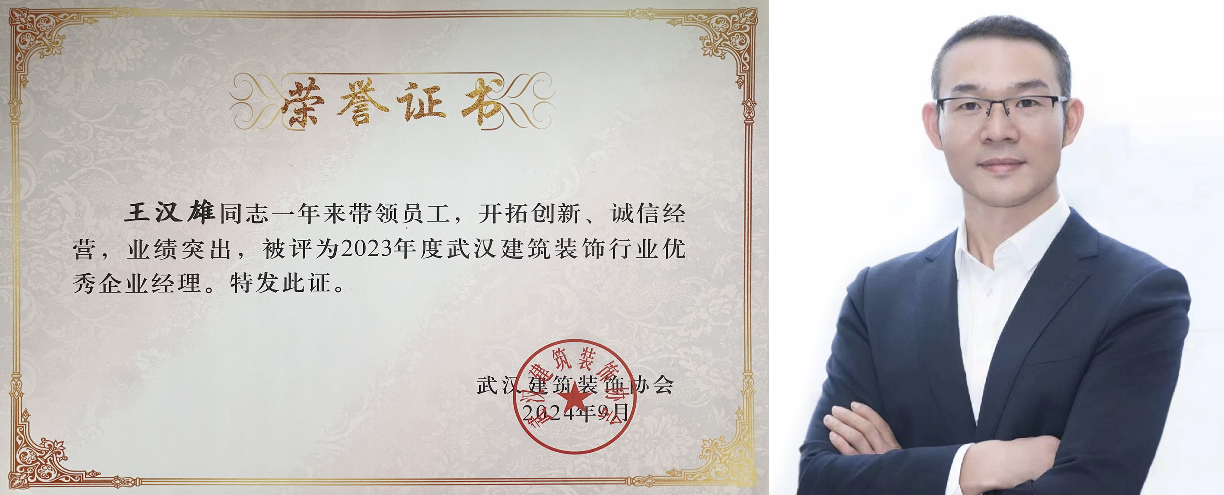 江南美装饰集团总裁王汉雄先生荣获2023年度武汉建筑装饰行业优秀企业经理荣誉!