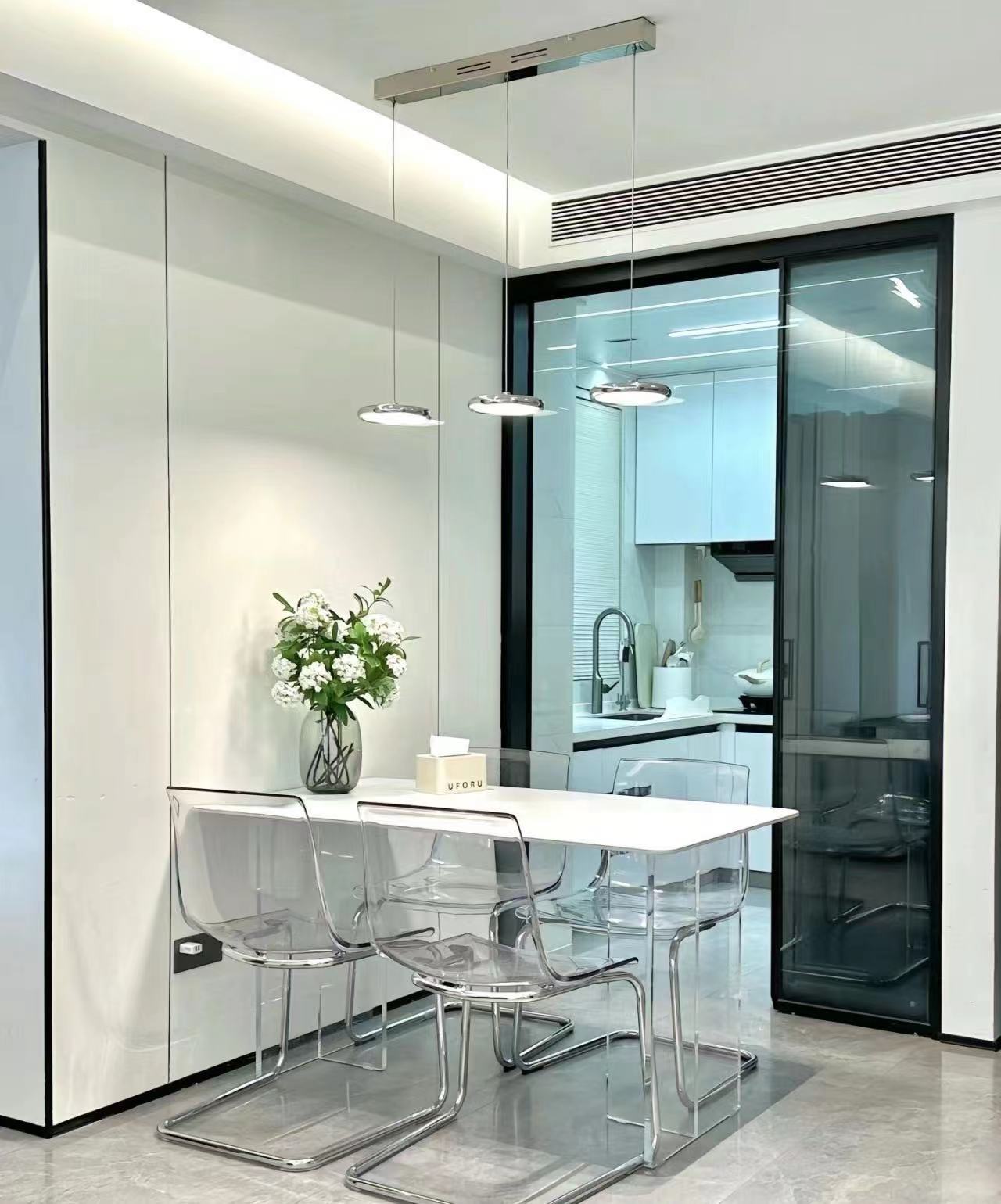 餐厅紧邻厨房,整体布局十分合理。白色四人餐桌在中央显得简洁而大方,正上方的时尚不锈钢吊灯则为用餐时刻增添了几分精致感。厨房采用半开放式设计,处理油烟较重的菜肴时可以关上玻璃门,迅速变身为一个密闭空间,既实用又美观。