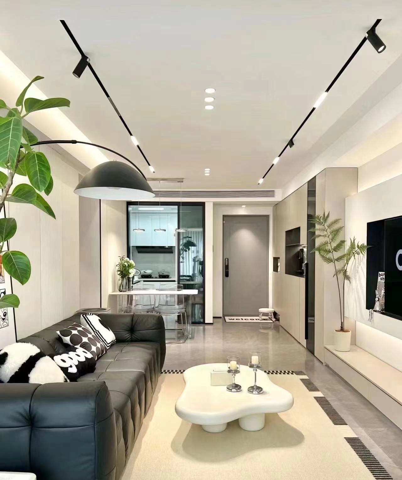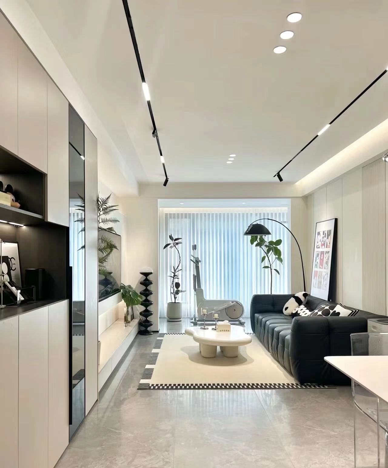 几盆大叶植物在角落静静生长,带来一抹生机与活力。黑色落地灯为整个空间提供柔和的光线,而白色纺织地毯与墙面则完美地中和了黑色与灰色的深沉,使室内显得更加明亮、宽敞。
