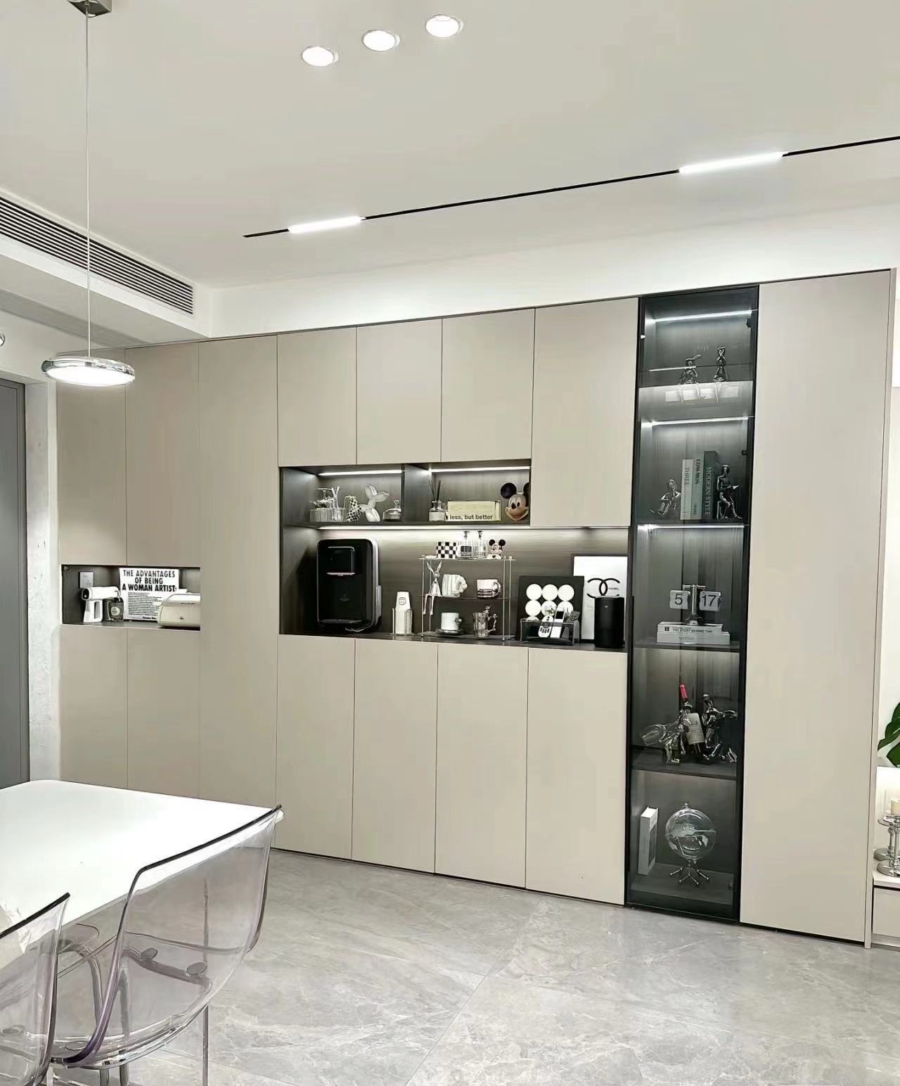 餐边柜采用淡灰色无把手设计,简约而不失功能性,成为重要的收纳空间。透明玻璃饰柜展示著精致的物件,而小型水吧则为家庭聚会增添了一丝轻松的氛围。