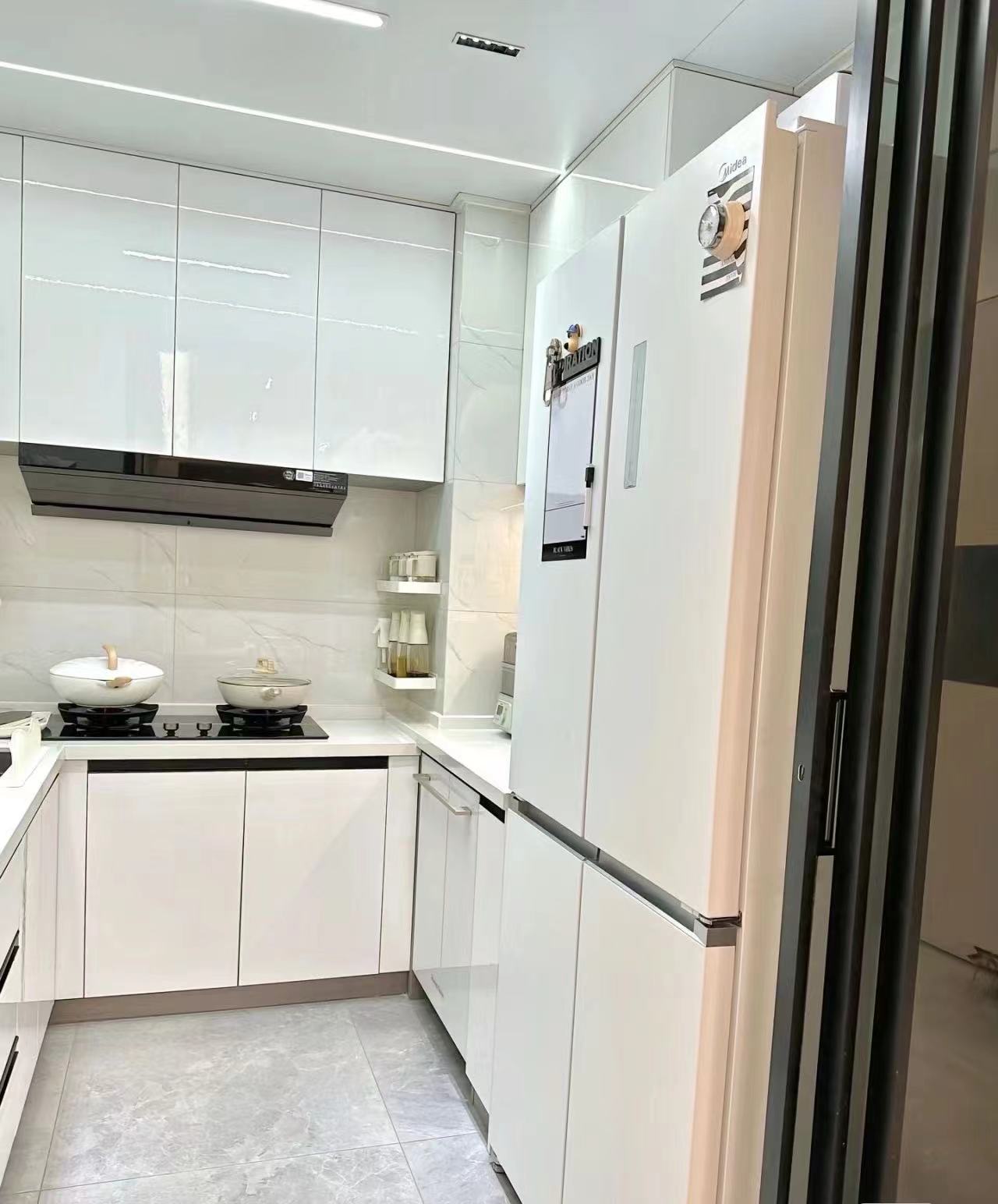 厨房以白色为主,地柜、吊柜、操作台面及冰箱均为同色系,搭配整齐的白色厨具,展现出极致的整洁感。每一处设计都经过精心考虑,体现出简约而不简单的生活理念。