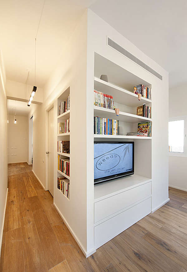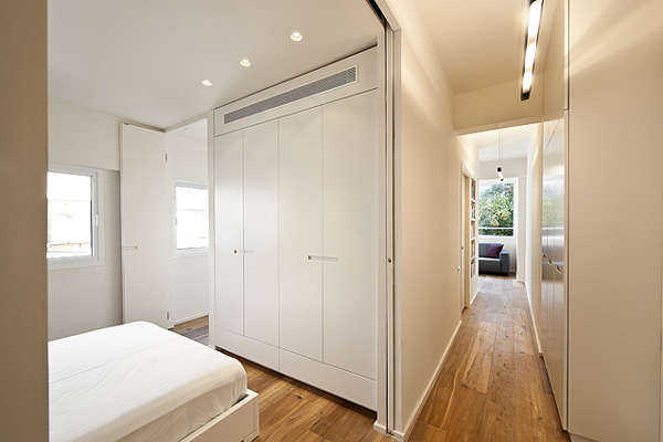 什么样的格局最适合位在边间的长型小公寓?这间50平米大的公寓原本是传统格局,房间跟浴室靠墙,由一条走廊连结所有空间。