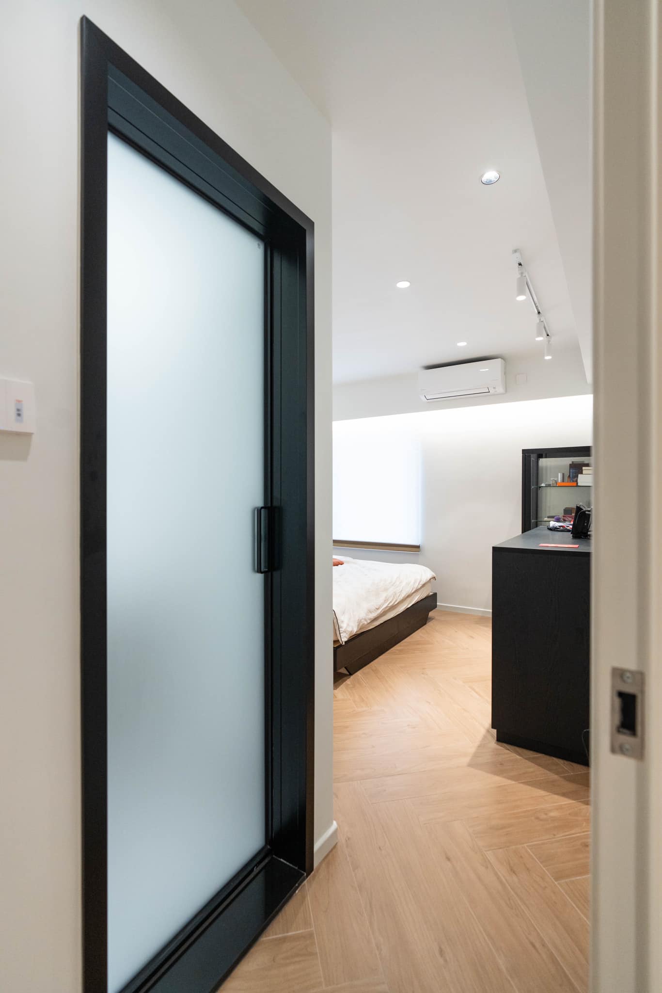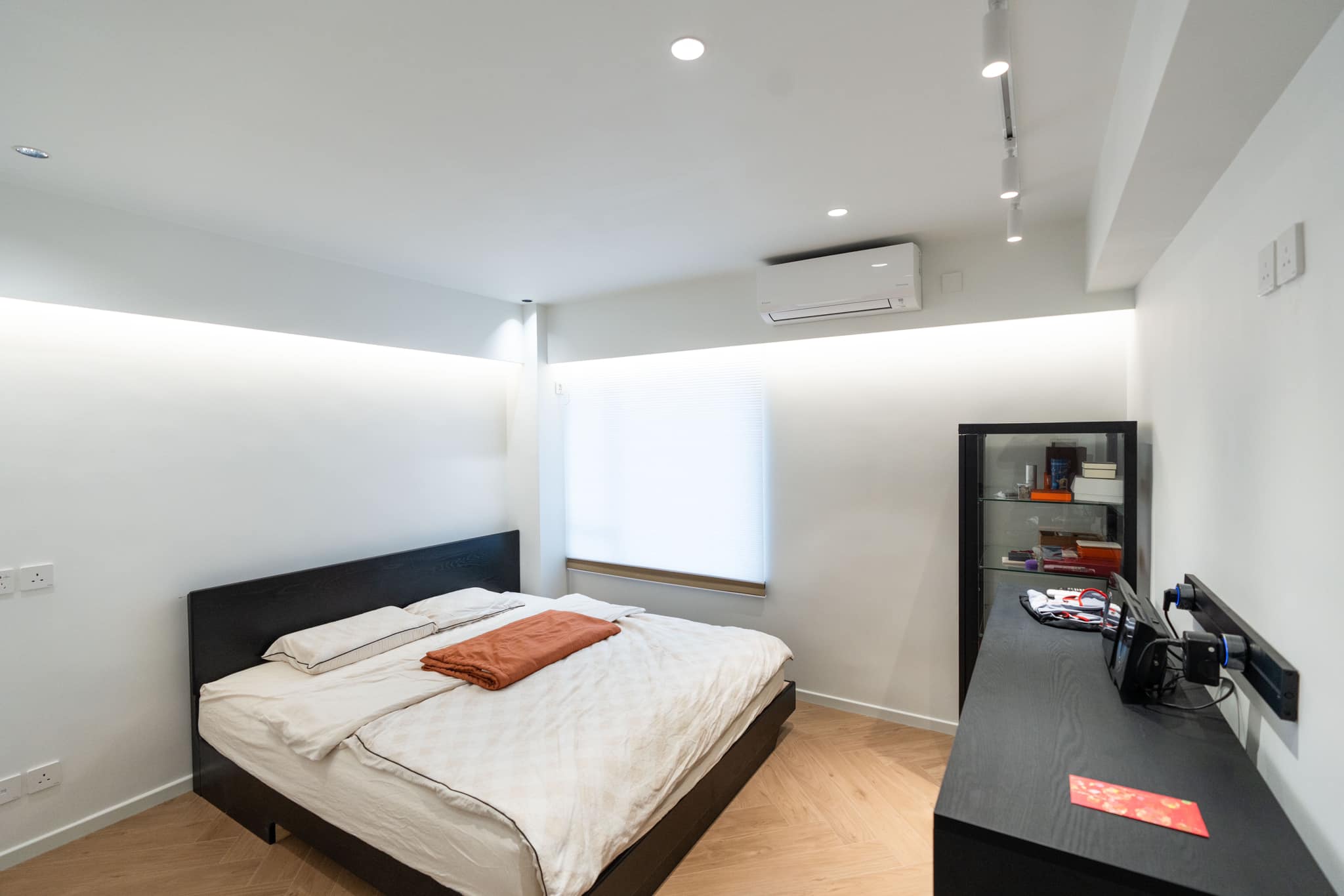 主卧室同样延续了白色和原木的设计风格。床头的墙面加入了柔和的灯光,增加了温馨感。一个原木色的小书桌提供了额外的工作或学习区域。通过巧妙的布局和家具选择,主卧室在有限的空间内实现了多种功能。