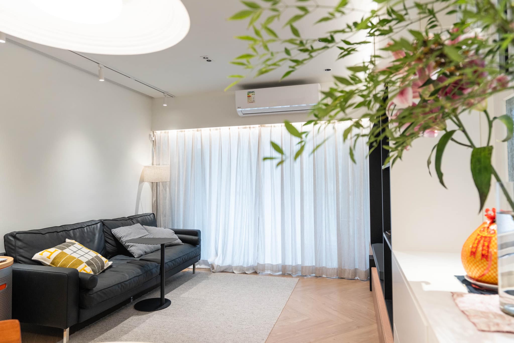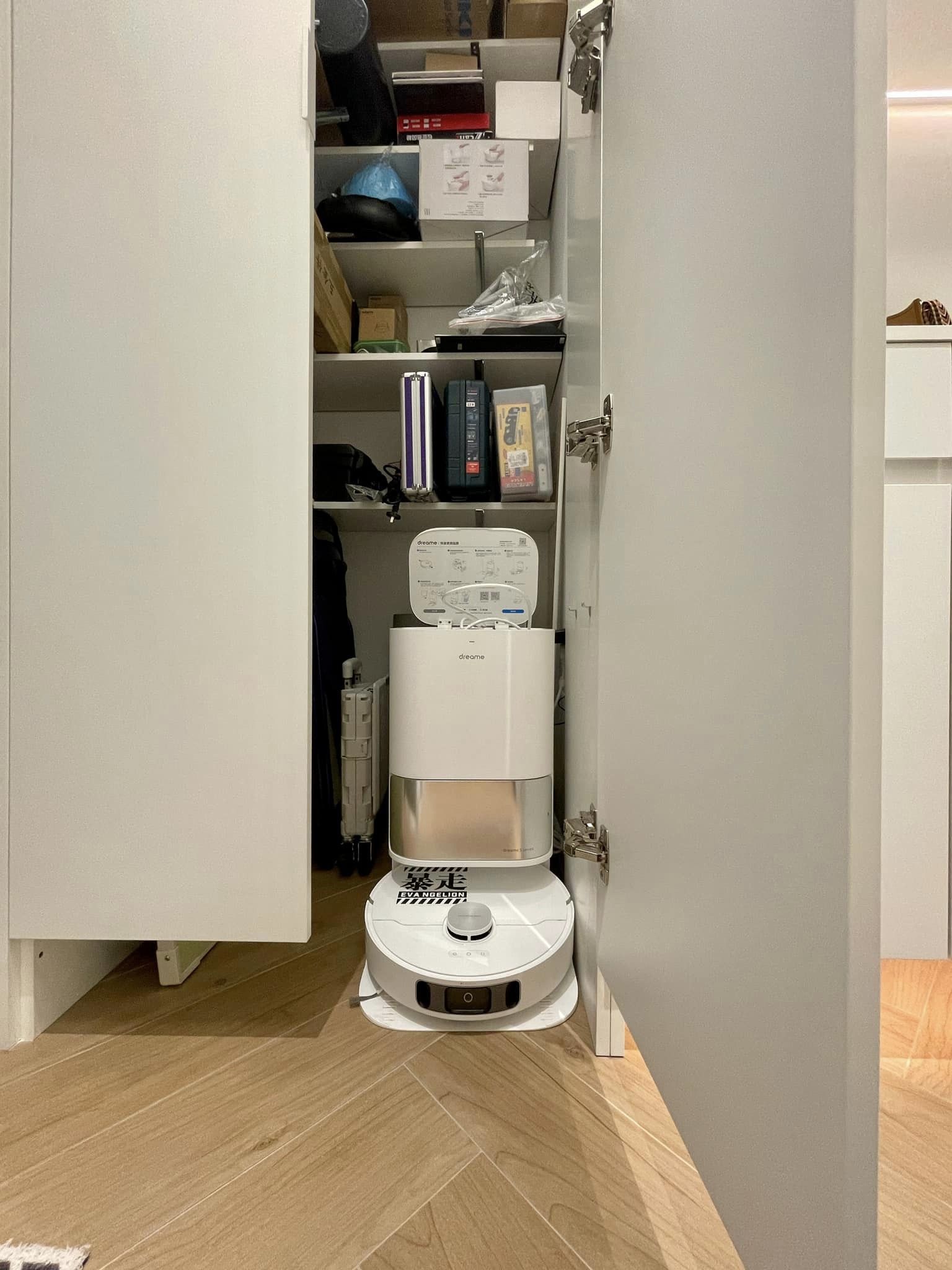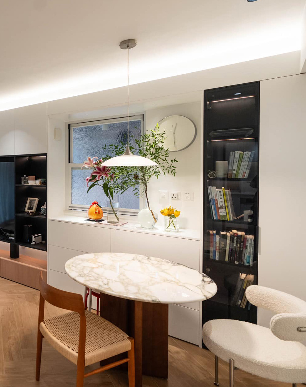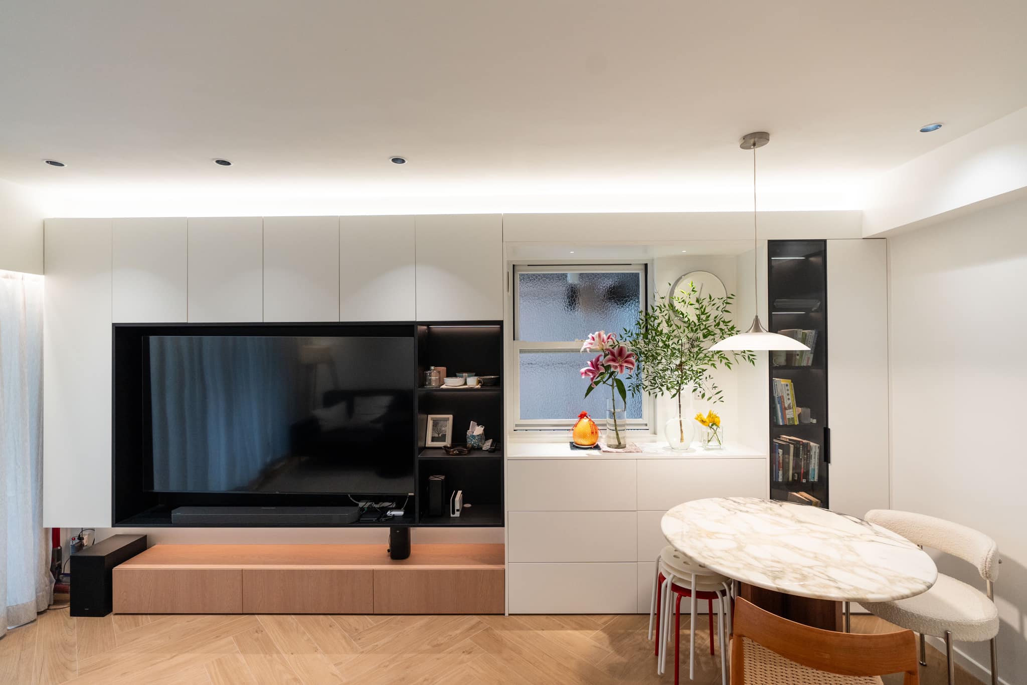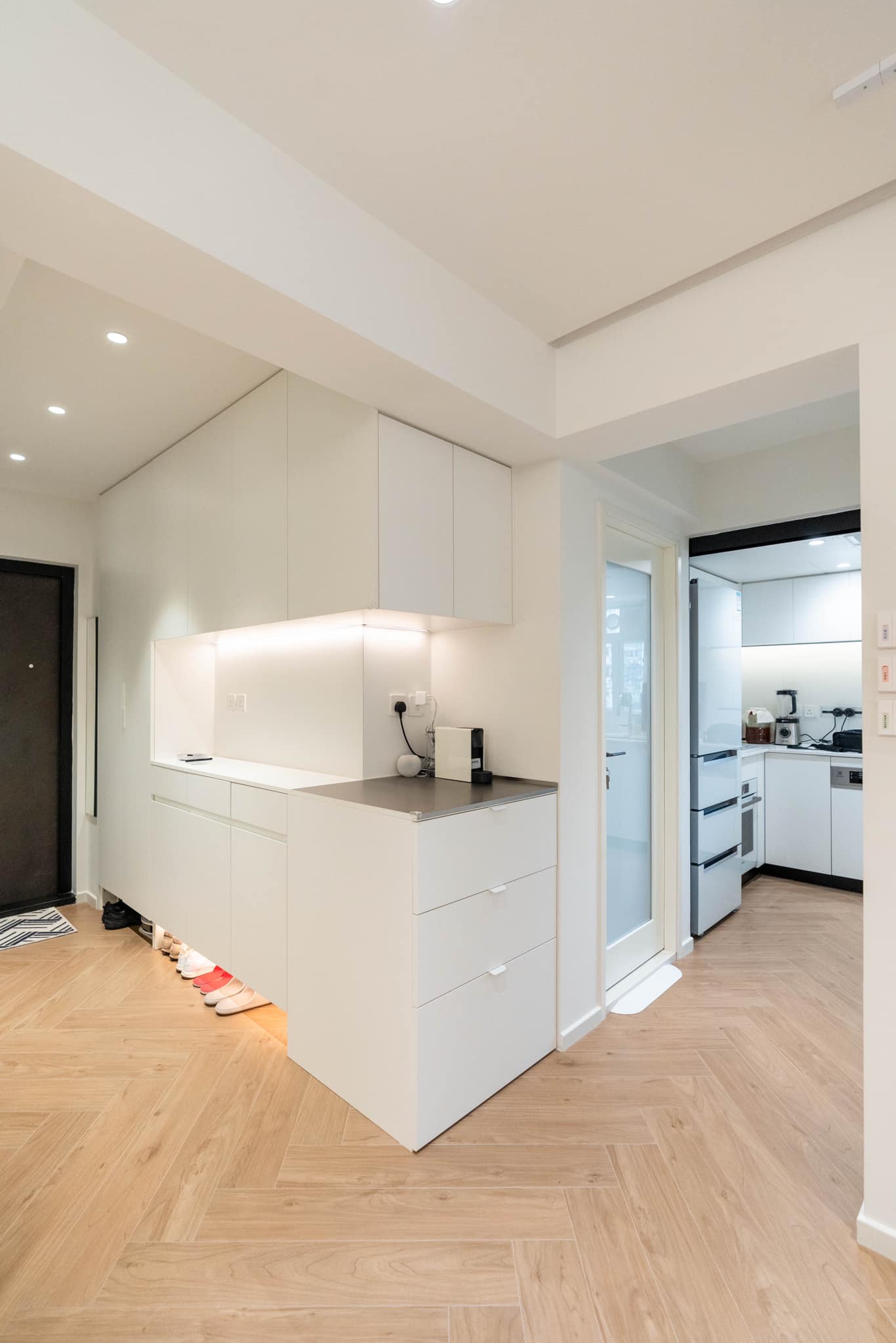 玄关是家居的门面,也是客人第一眼看到的地方。这个小户型的玄关采用了纯白色调,给人一种明亮和清爽的感觉。一个定制的玄关柜不仅提供了储物空间,还安放了扫地机器人,确保整个屋子的清洁。