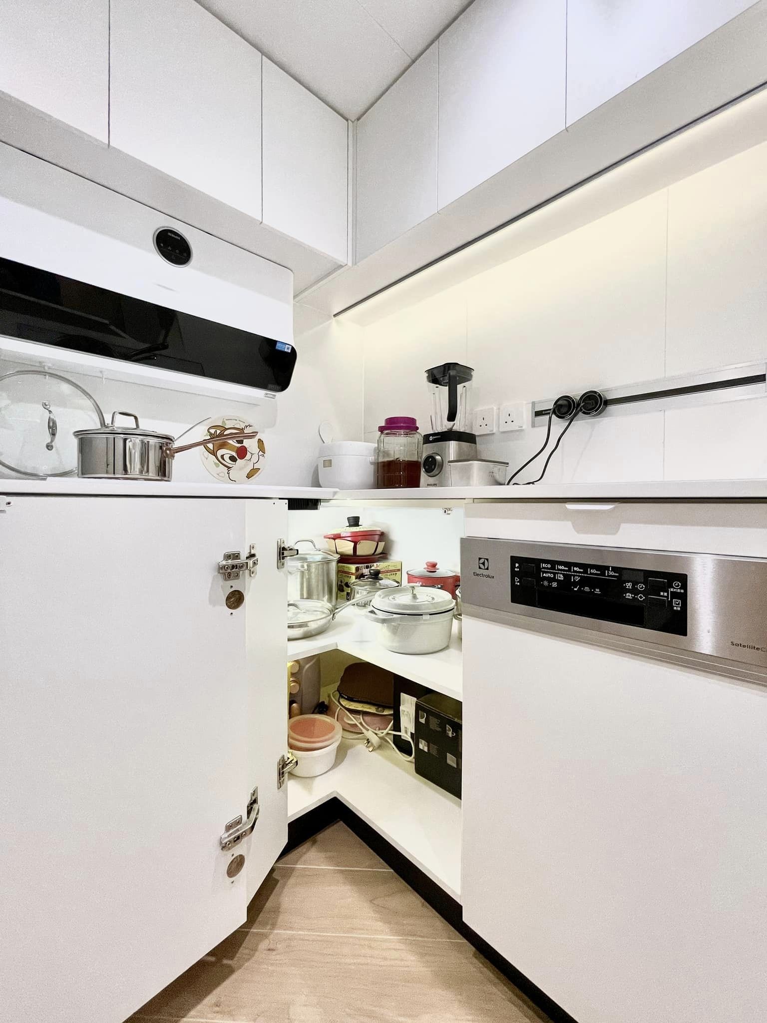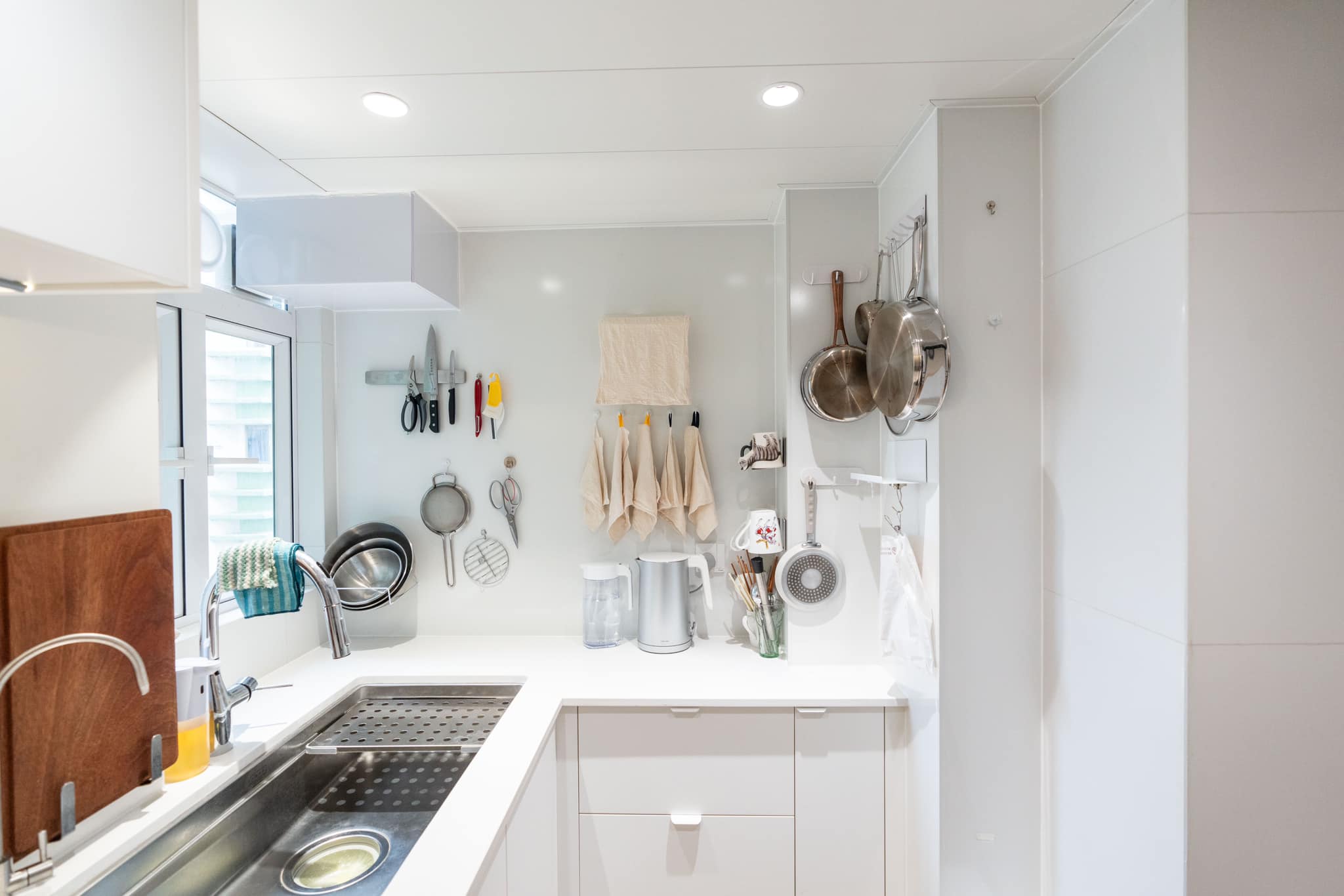 小户型的厨房设计着重于最大化的收纳空间。橱柜采用纯白色调,橱柜的拐角处也得到了合理的利用。墙上的壁挂式收纳架增加了额外的储物空间,让厨房变得井然有序。不仅如此,白色的墙面也增强了厨房的明亮度,使工作更加愉快。