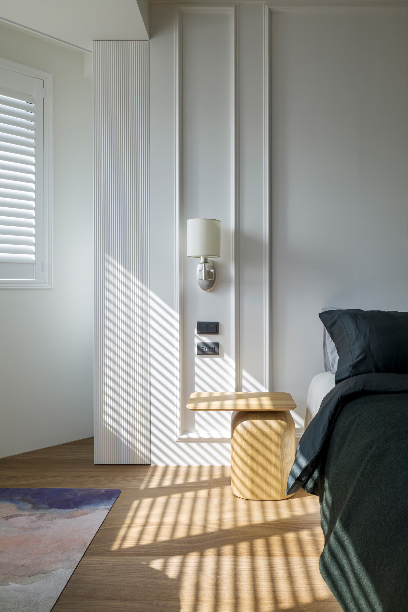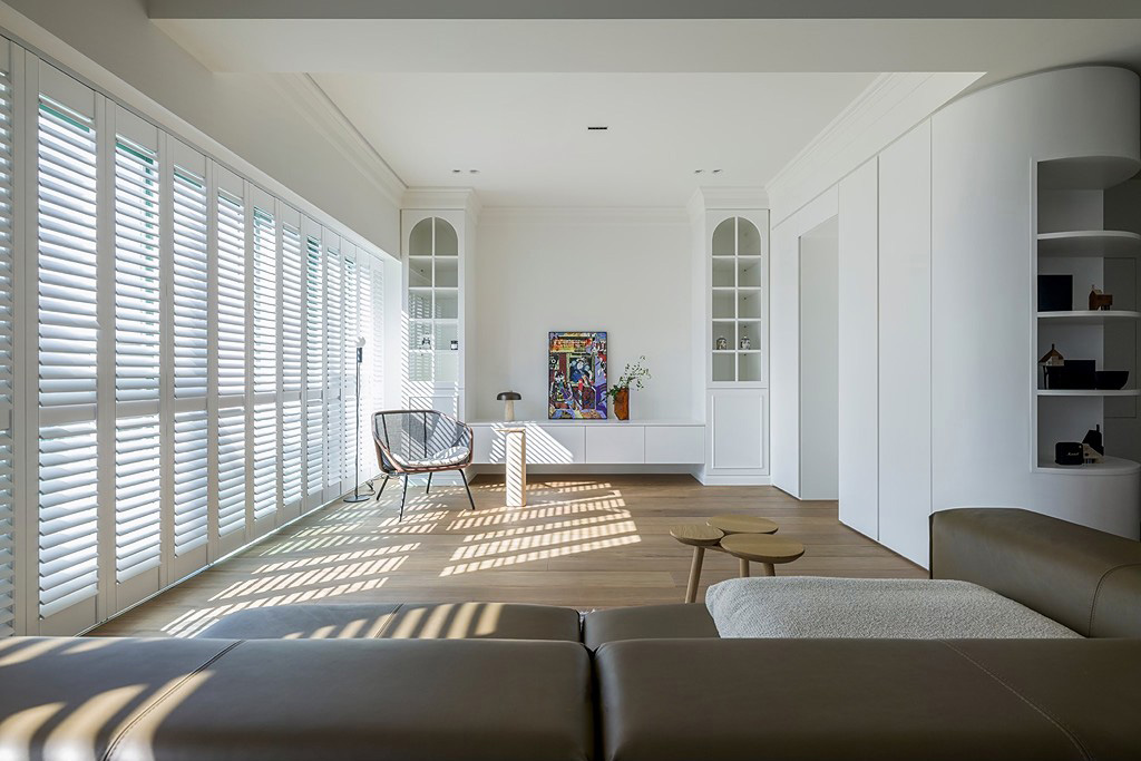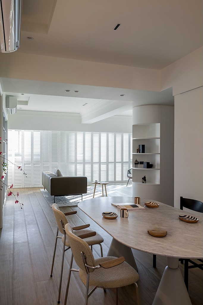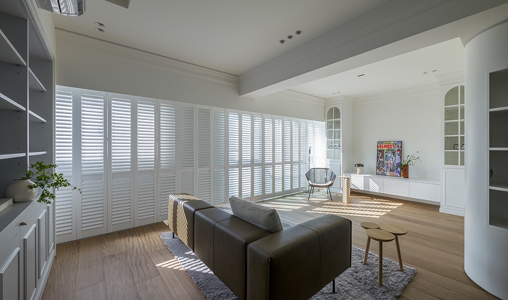 大面积木百叶和实木地板相得益彰,为整体空间带来温暖和变化。