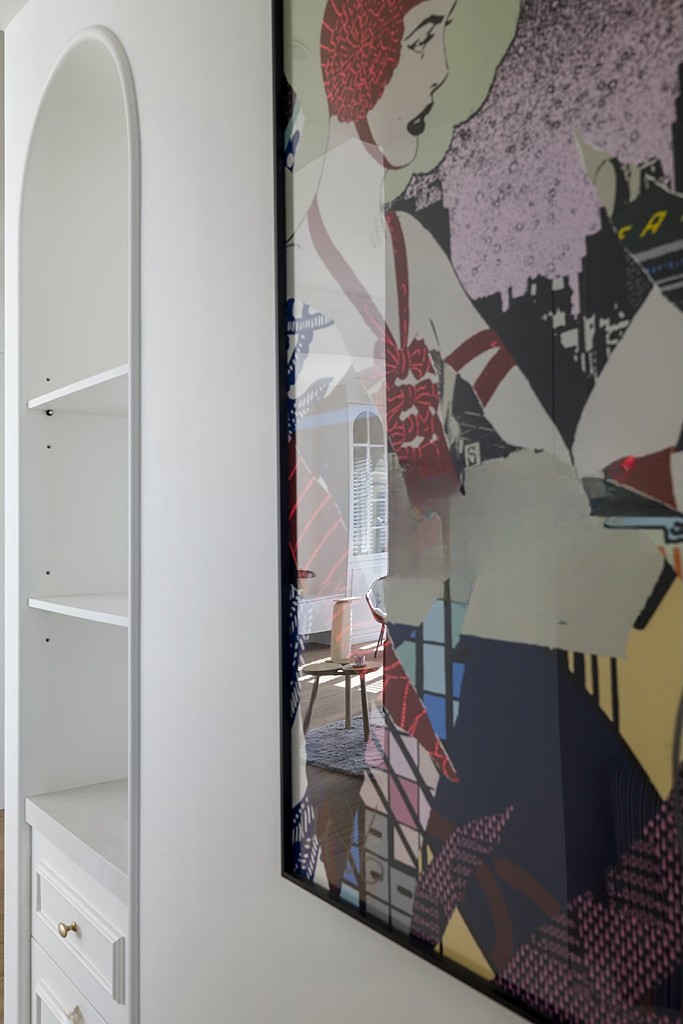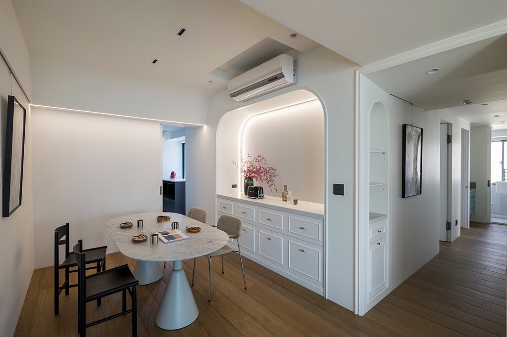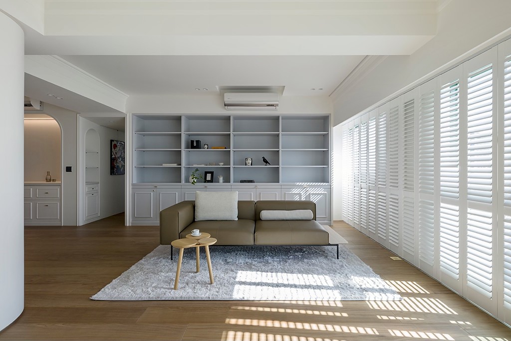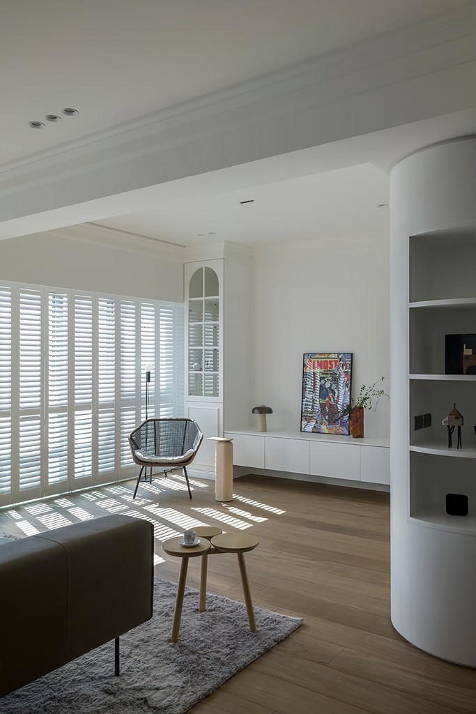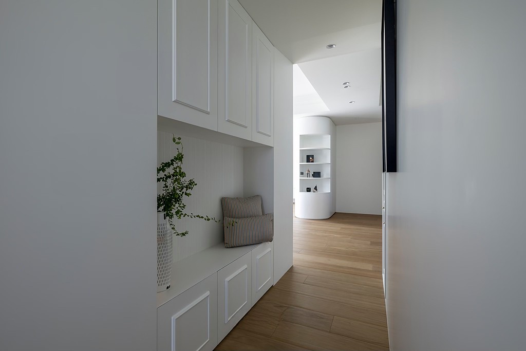 玄关以带有开放格的圆弧柱体提供收纳,同时在公共空间成为自然的区域划分与视觉焦点。