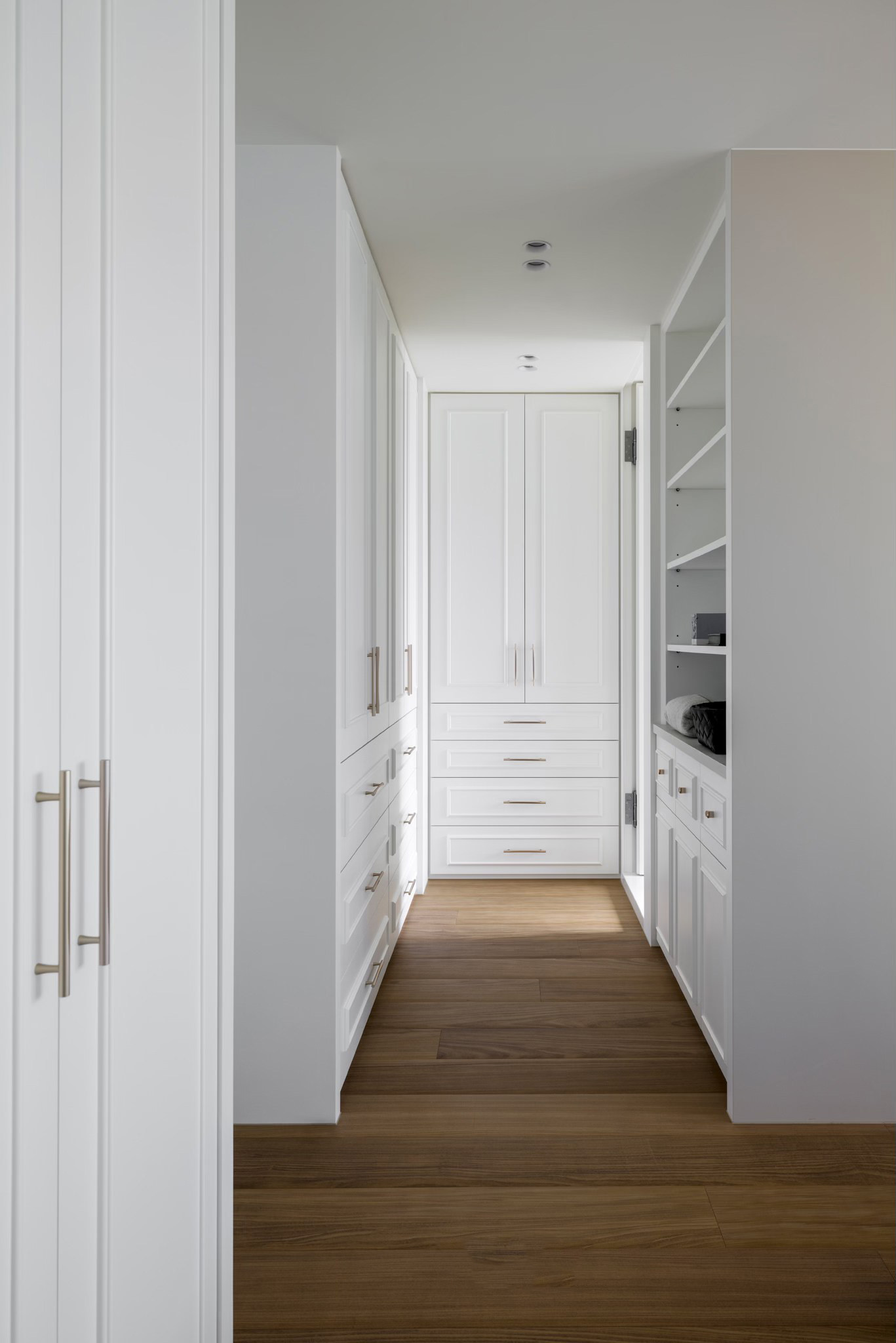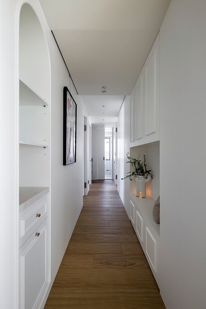 长廊走道通过天花板设计制造高低差,拉升行走视线,两侧增设功能性开放柜,缩短无用走道。