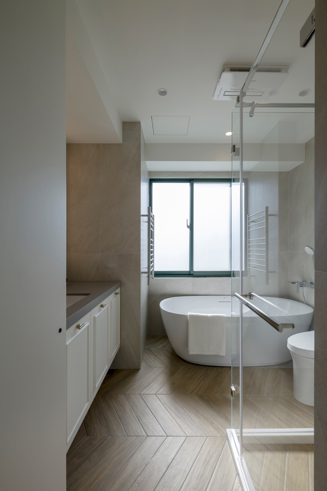 主卧室采用双面柜设计,多划出一个更衣室区域,提高收纳和私密性。